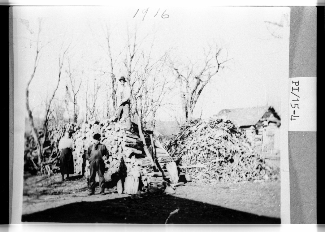 Title: John Lund family on top of stone pile at John Lund homestead