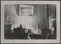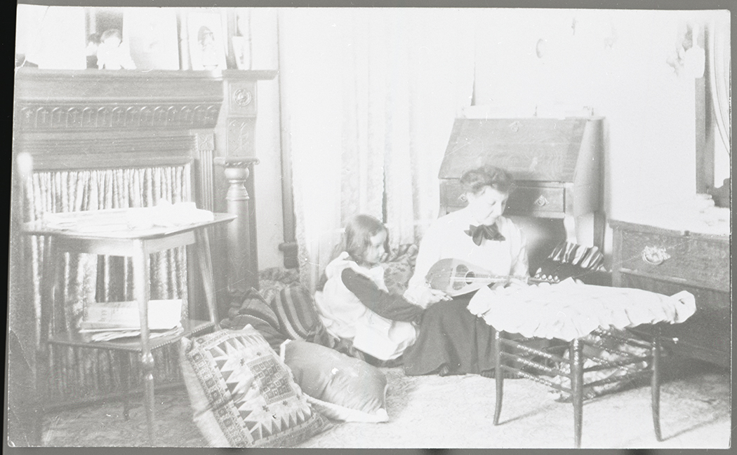 Title: Mrs. Aandahl playing a mandolin in the living room of the Old Governor's Mansion, Bismarck (N.D.)