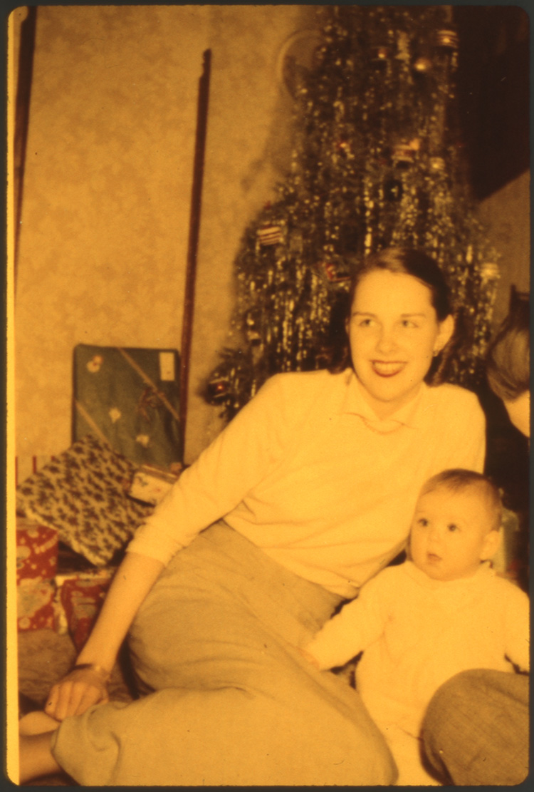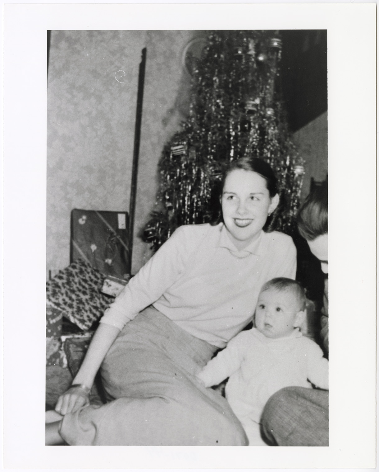 Title: Governor Fred G. Aandahl's daughter Louise and a baby at the Old Governor's Mansion, Bismarck, N.D at Christmas