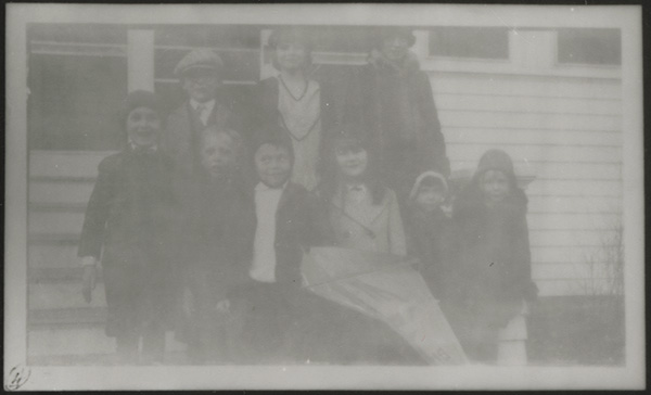 Title: Nine children pose on the front steps of the Old Governor's Mansion, Bismarck (N.D.)