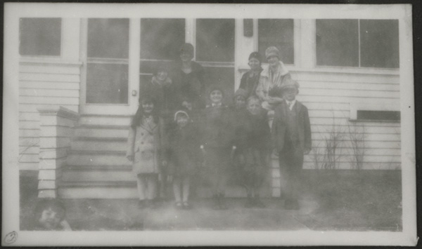 Title: Eleven youngsters pose on the front porch steps at the Old Governor's Mansion, Bismarck (N.D.)