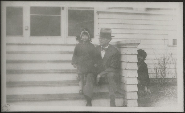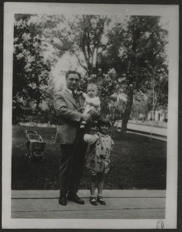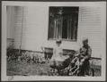 Title: Governor Fred G. Aandahl with two small children on the porch steps of the Old Governor's Mansion, Bismarck (N.D.)