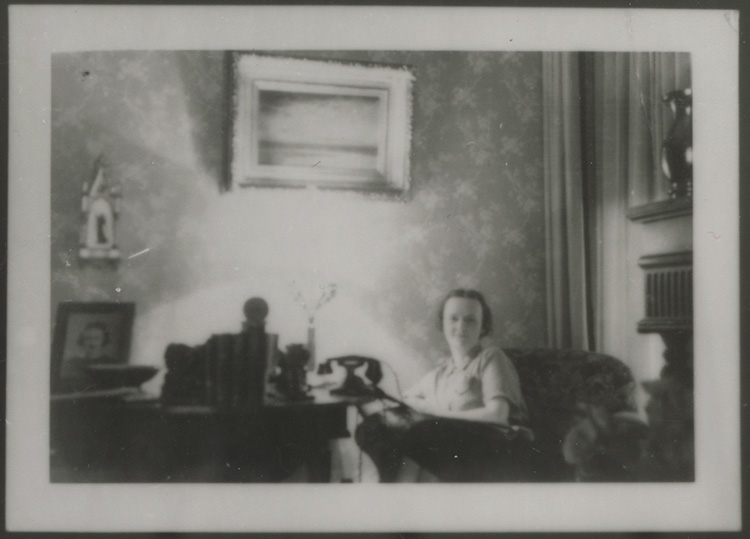 Title: Woman beside the living room telephone in the Old Governor's Mansion, Bismarck (N.D.)