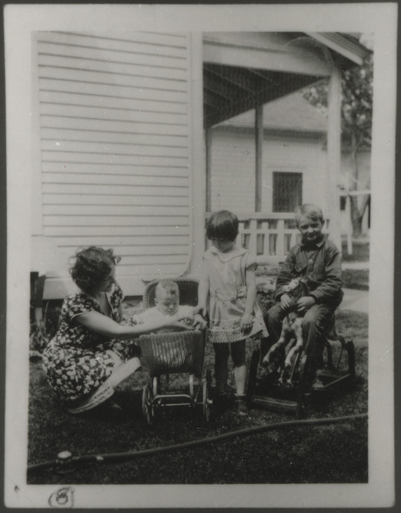 Title: Woman and three children by the back door of the Old Governor's Mansion, Bismarck (N.D.)