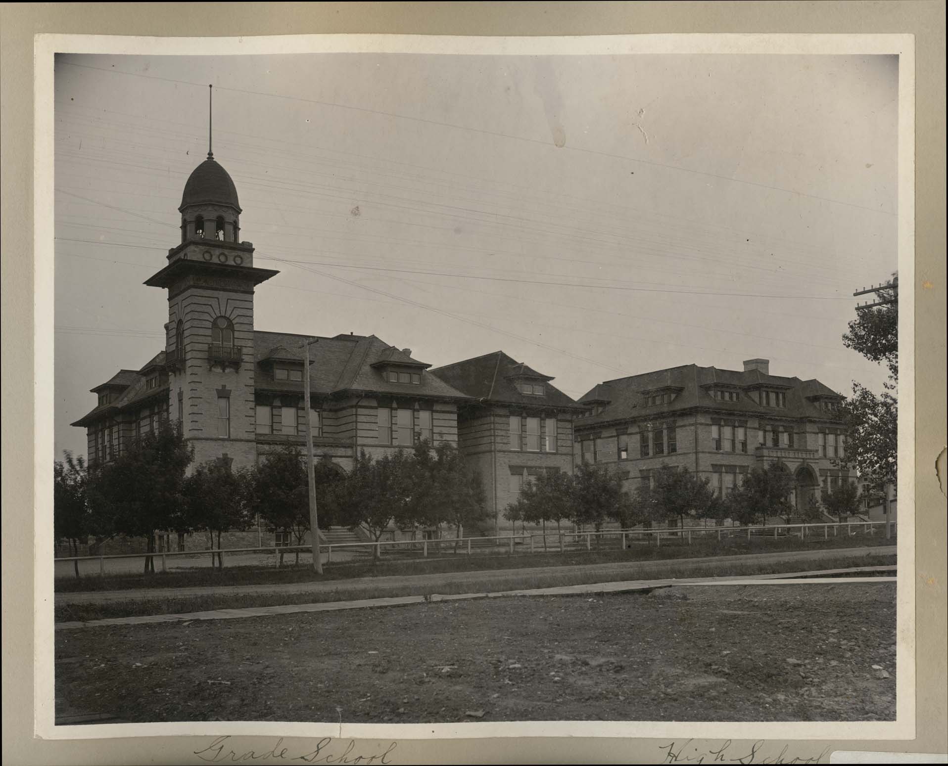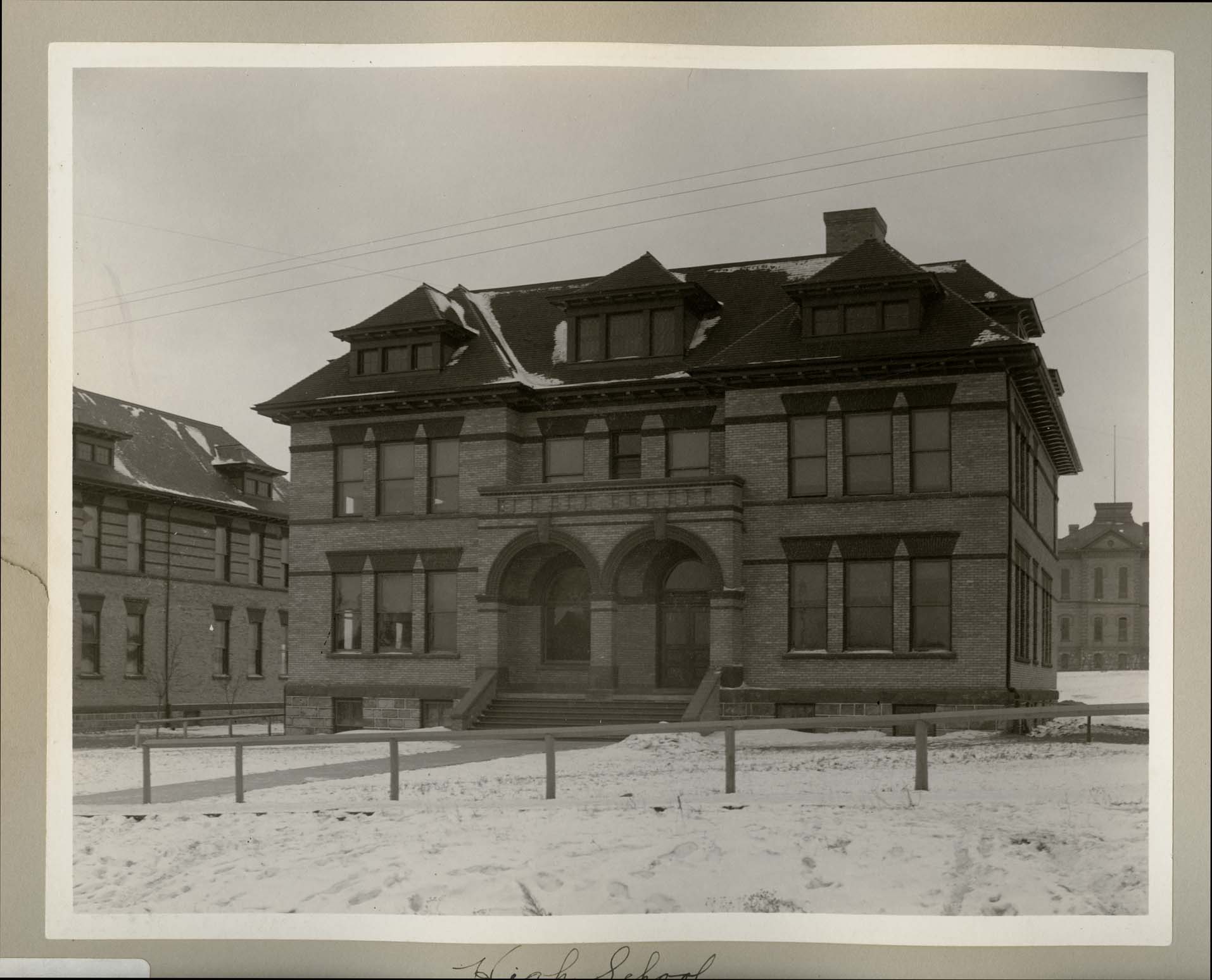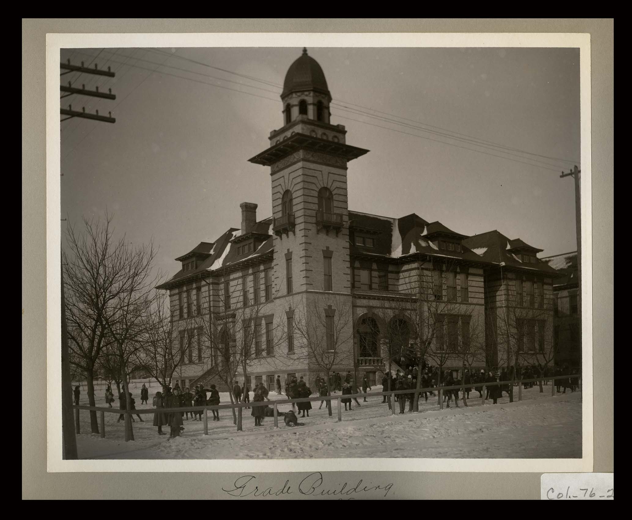 Title: Students and teachers gather in the snow in front of the Grade School Building, Valley City (N.D.)