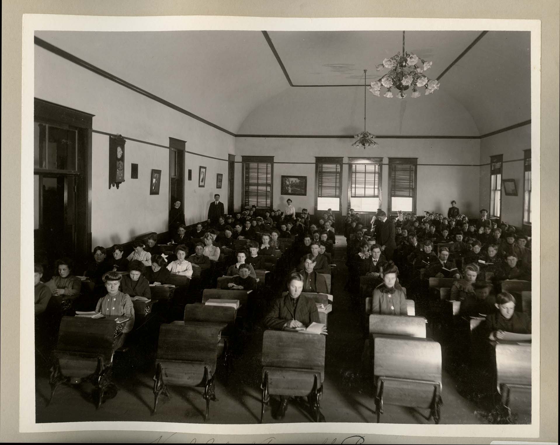 Title: The High School Assembly Room with seated students and standing teachers, Valley City (N.D.).