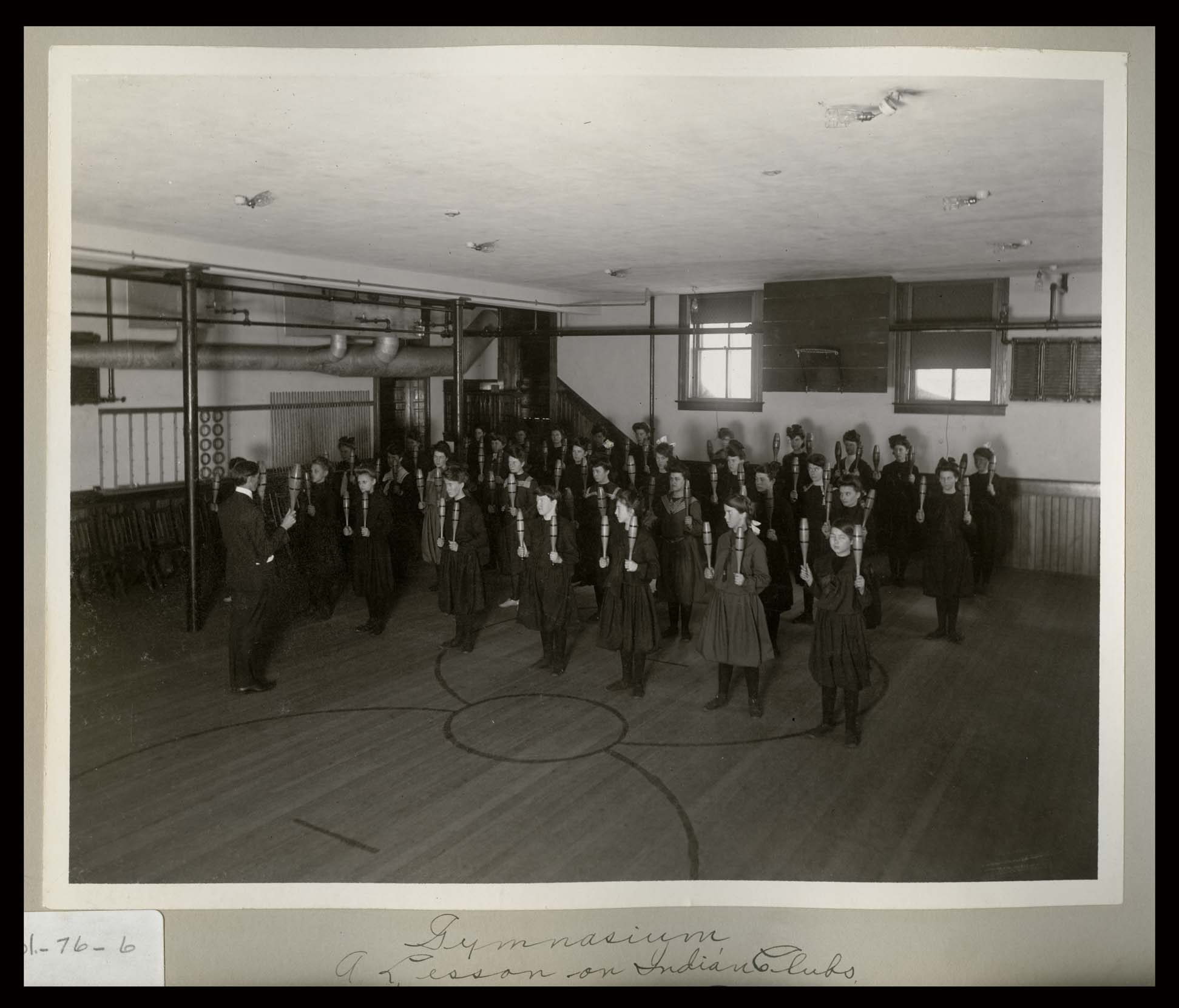 Title: Female students having a Indian Clubs lesson in the gymnasium of the Valley City High School(N.D.)
