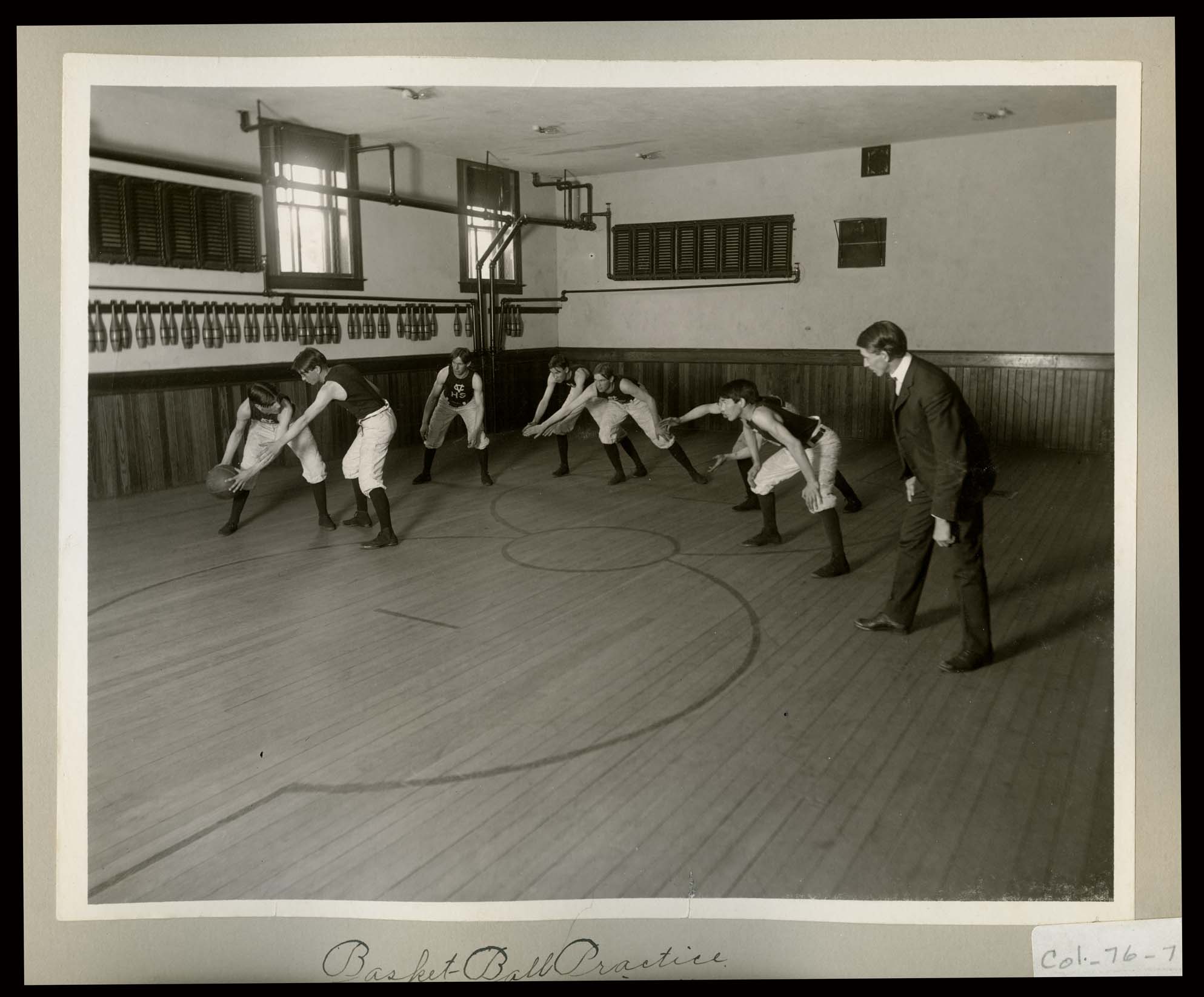 Title: Young male students and their coach at basketball practice in the high school gymnasium, Valley City (N.D.)