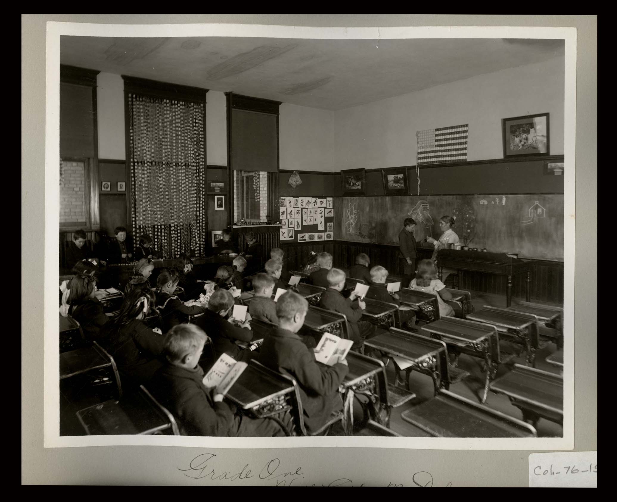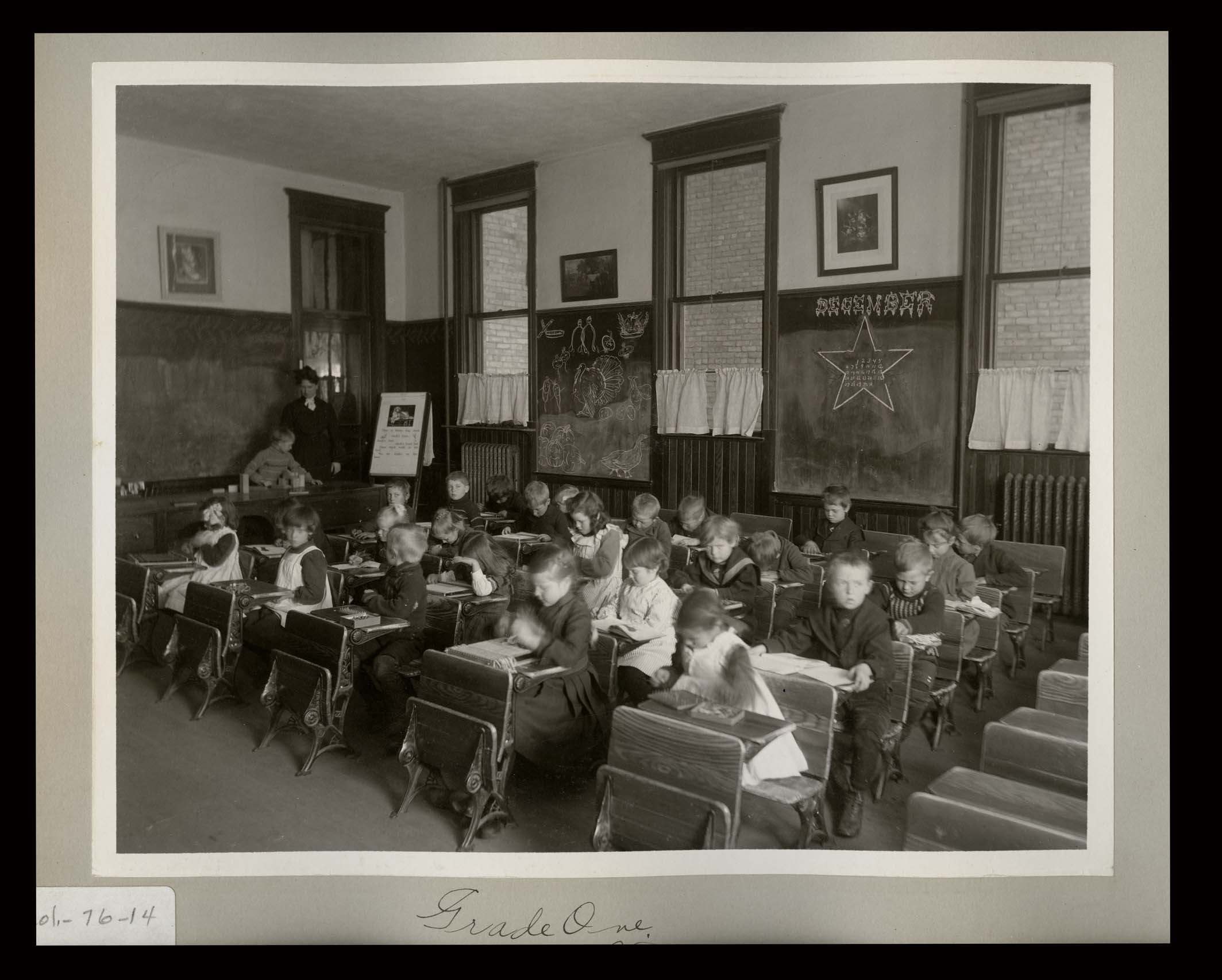 Title: Students and teacher in their Grade One Elementary School classroom in Valley City (N.D.)
