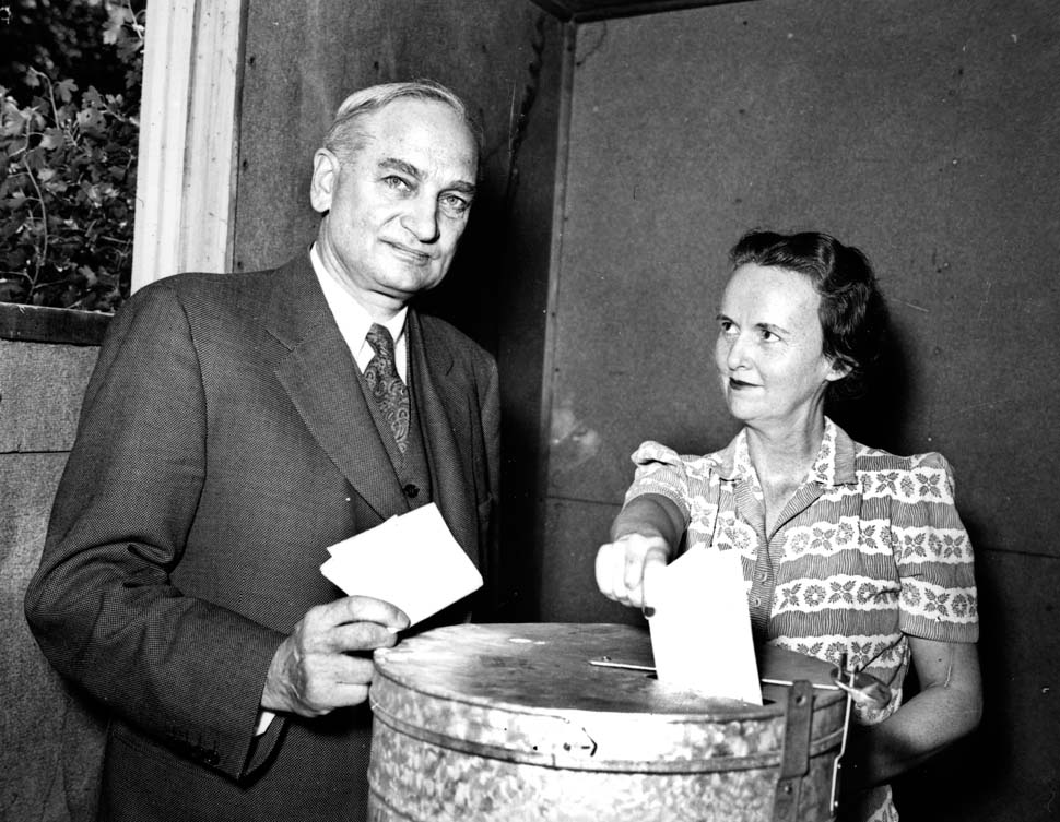 Title: William and Lydia Langer voting, Bismarck (N.D.)