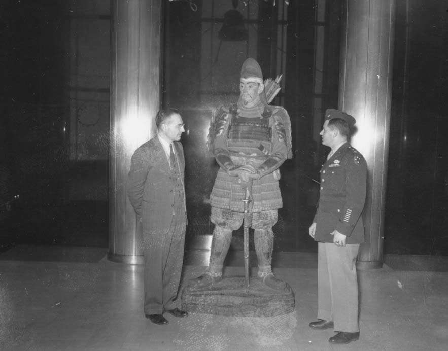 Title: Fred G. Aandahl with soldier and samurai statue, Bismarck (N.D.)