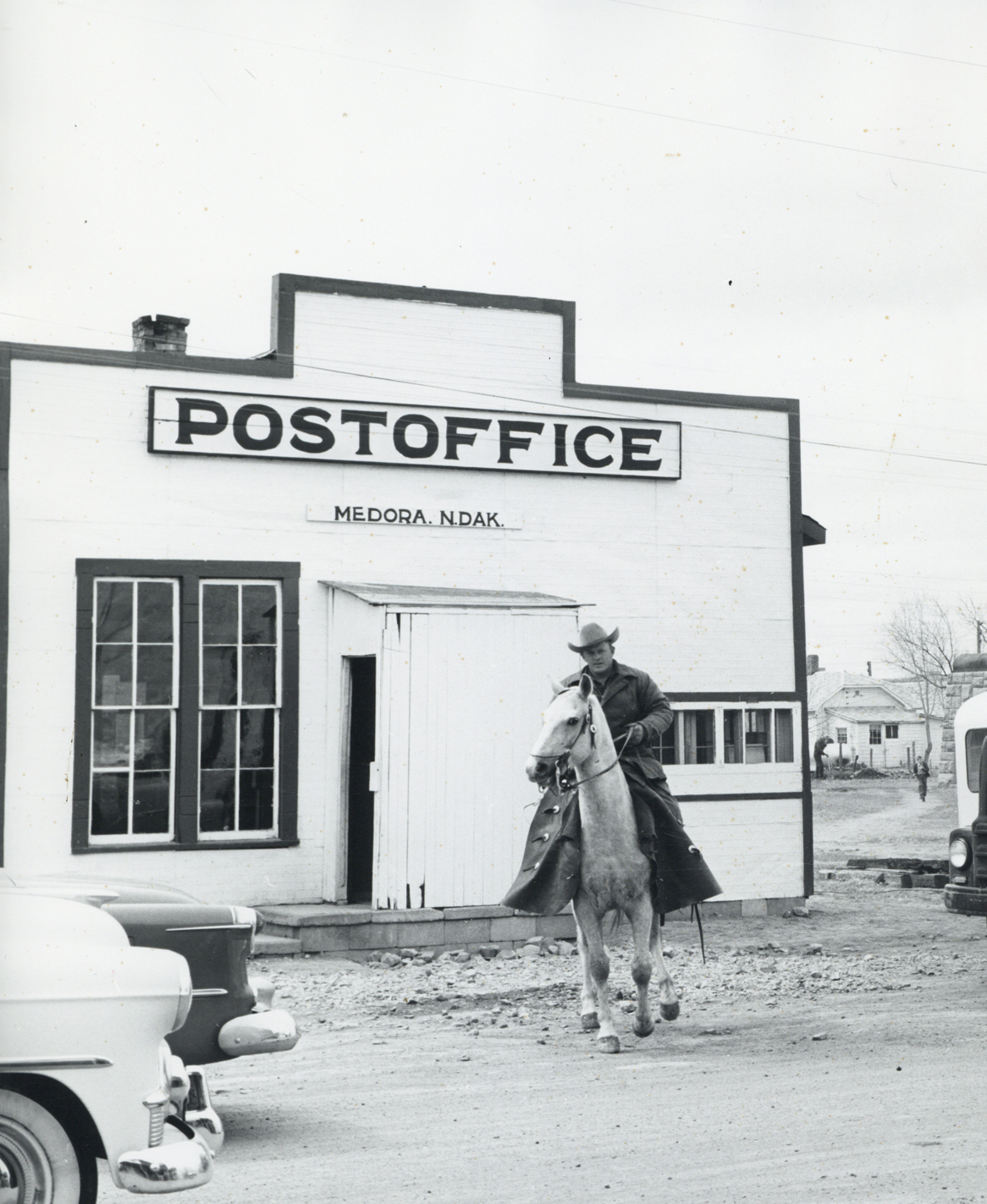 Title: Man on horse in front of post office, Medora (N.D.)