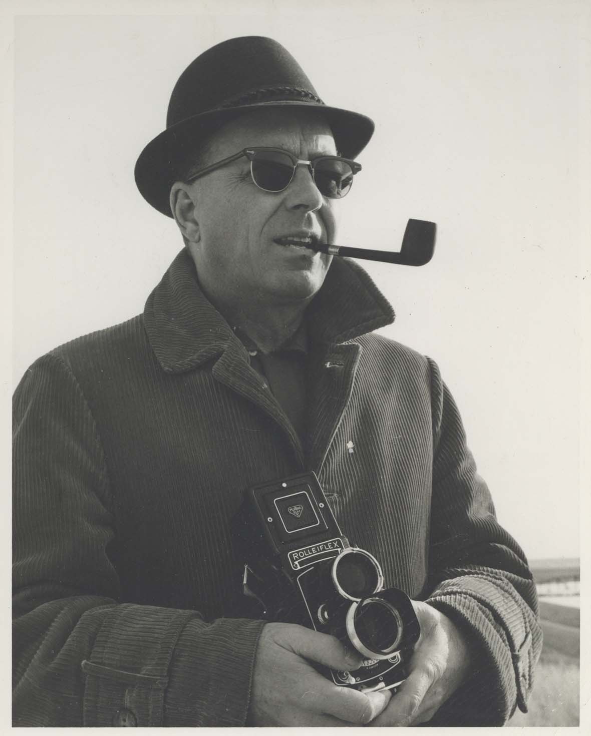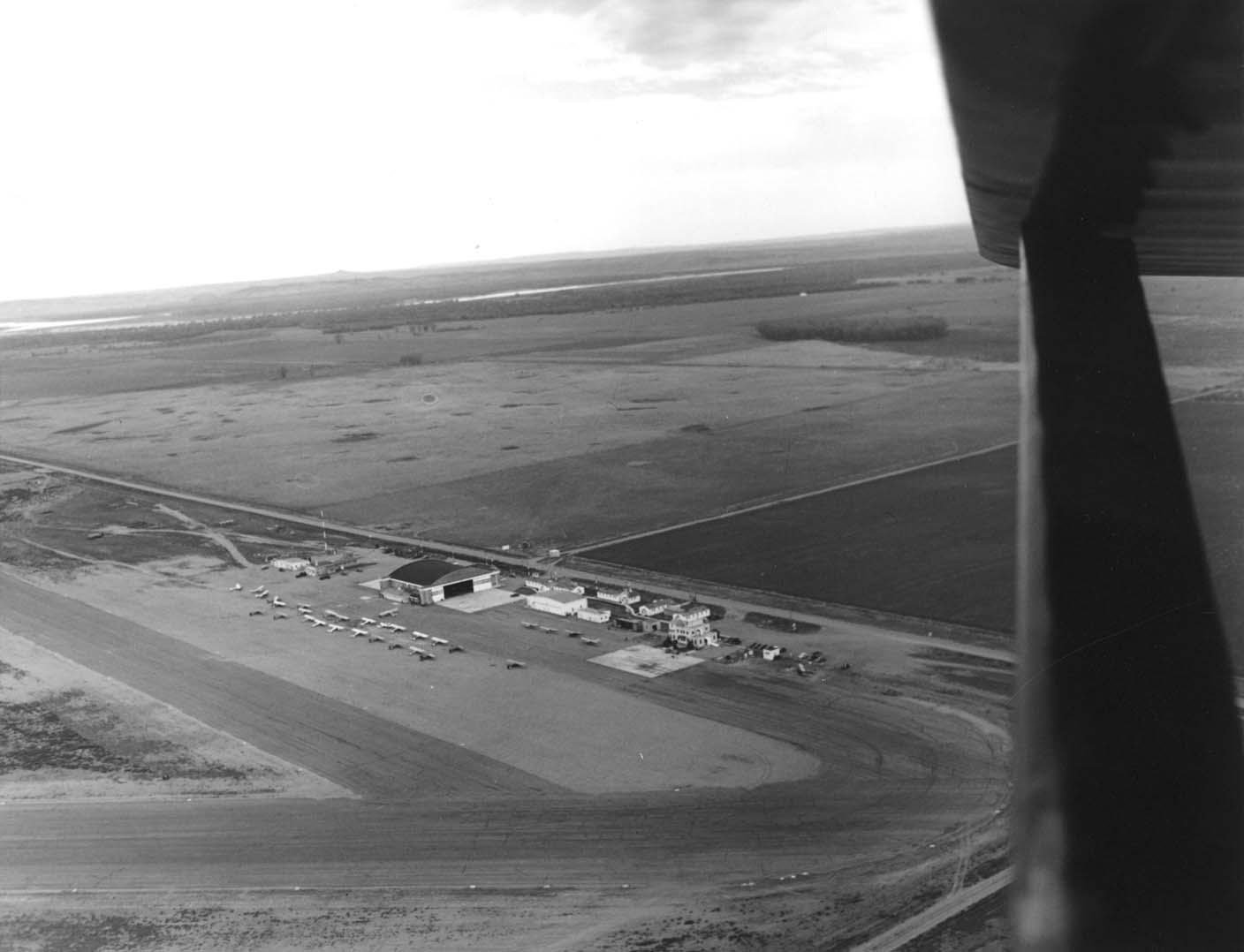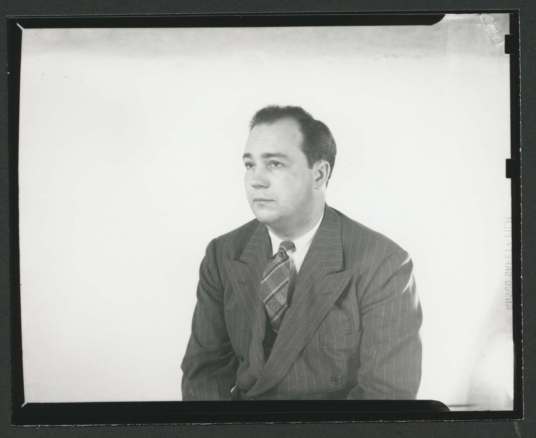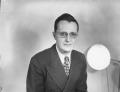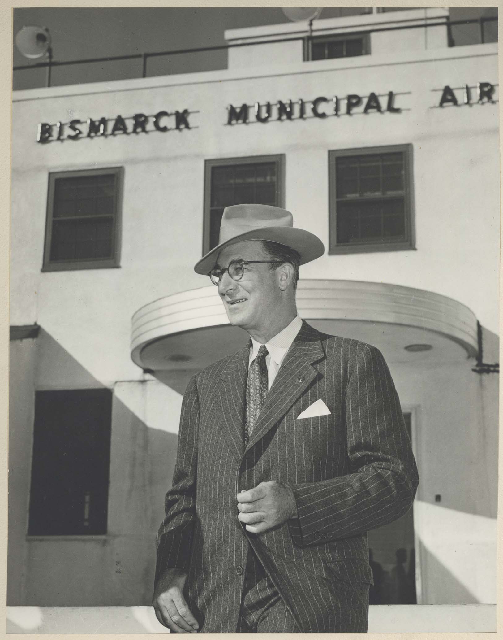 Unidentified man in suit in front of Bismarck Municipal Airport, Bismarck (N.D.)
