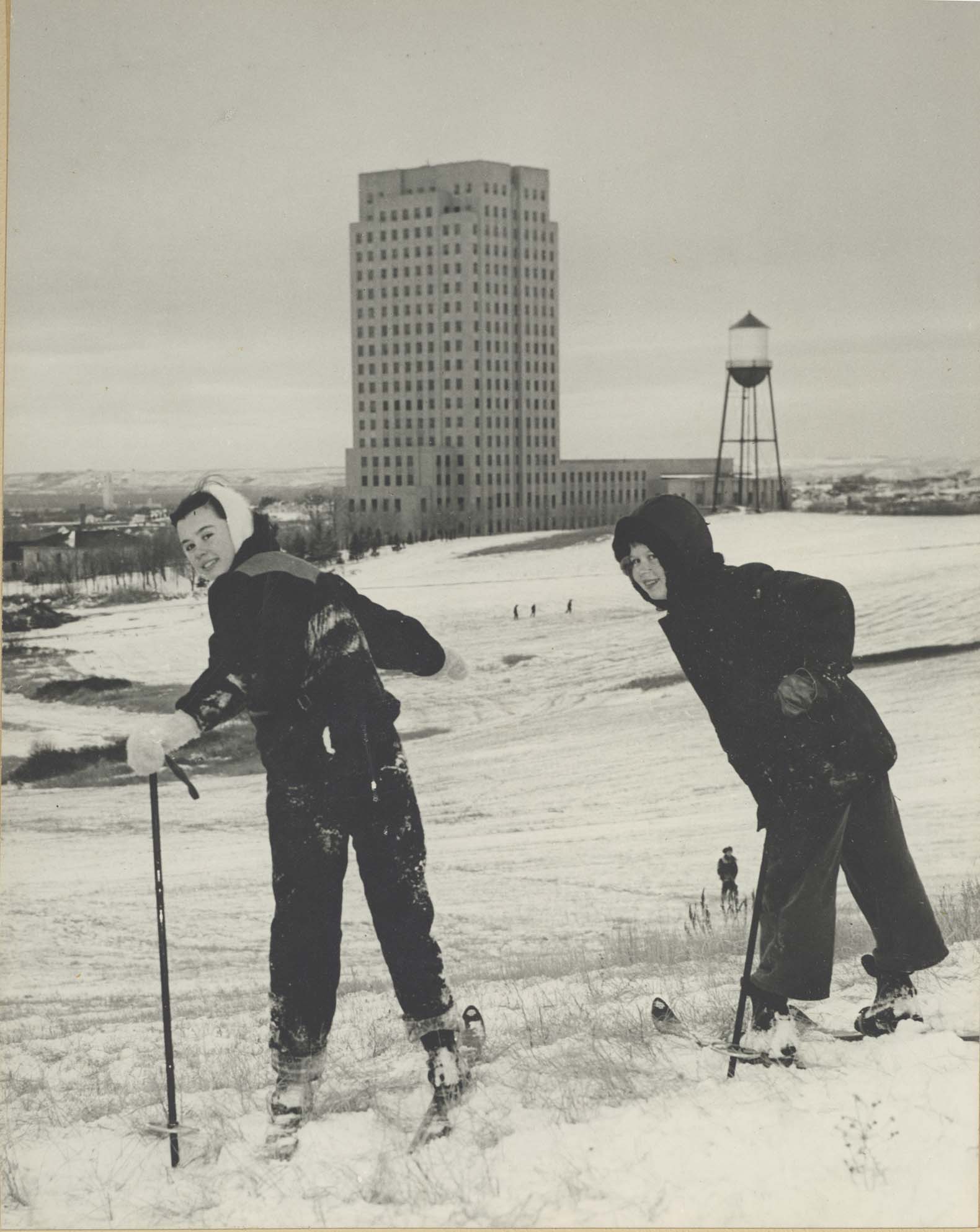 Two unidentified women cross country skiing at North Dakota capitol, Bismarck (N.D.)