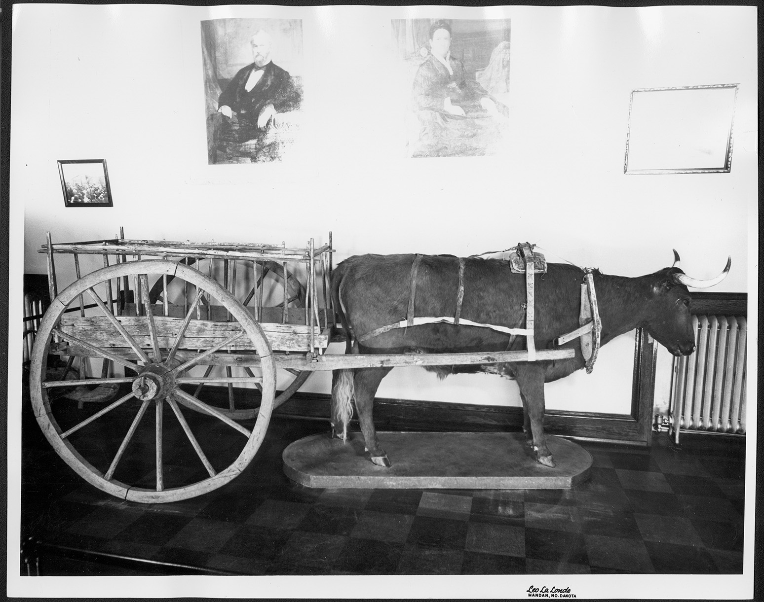 Red River cart and ox on display in Liberty Memorial Building