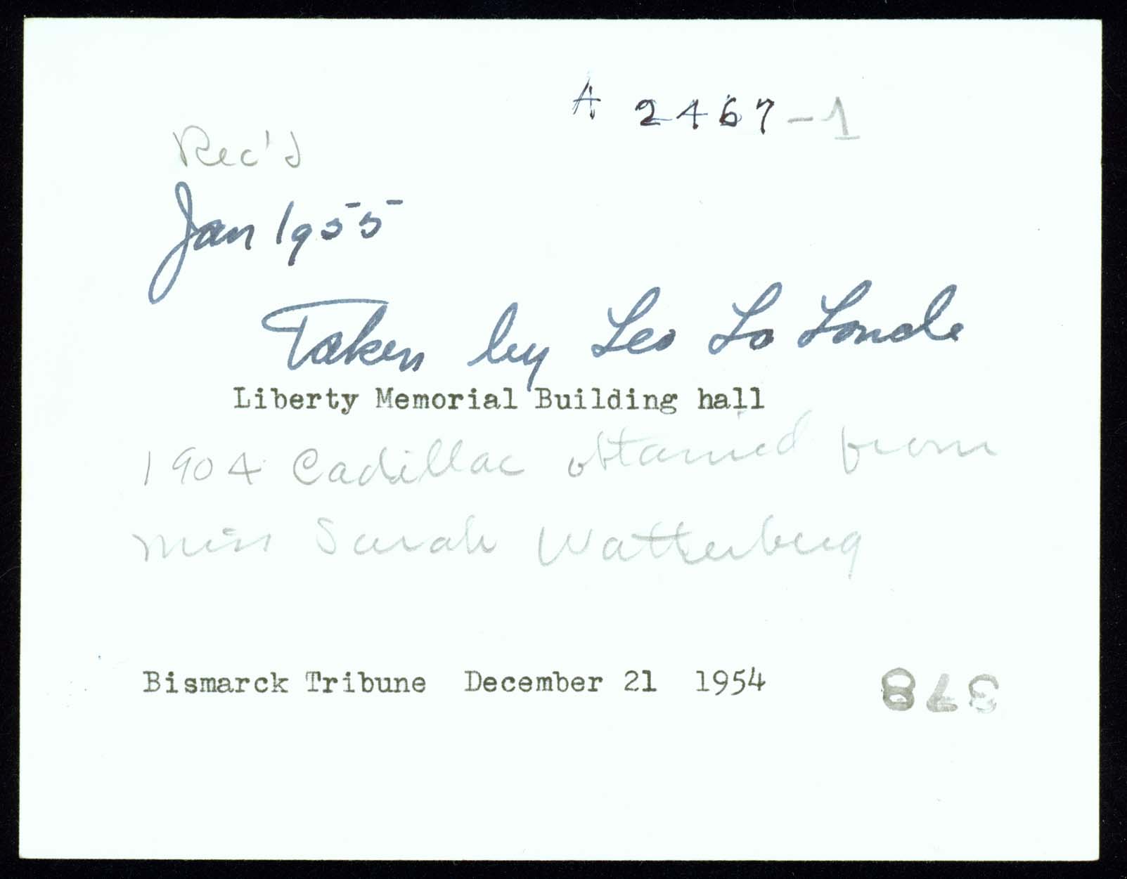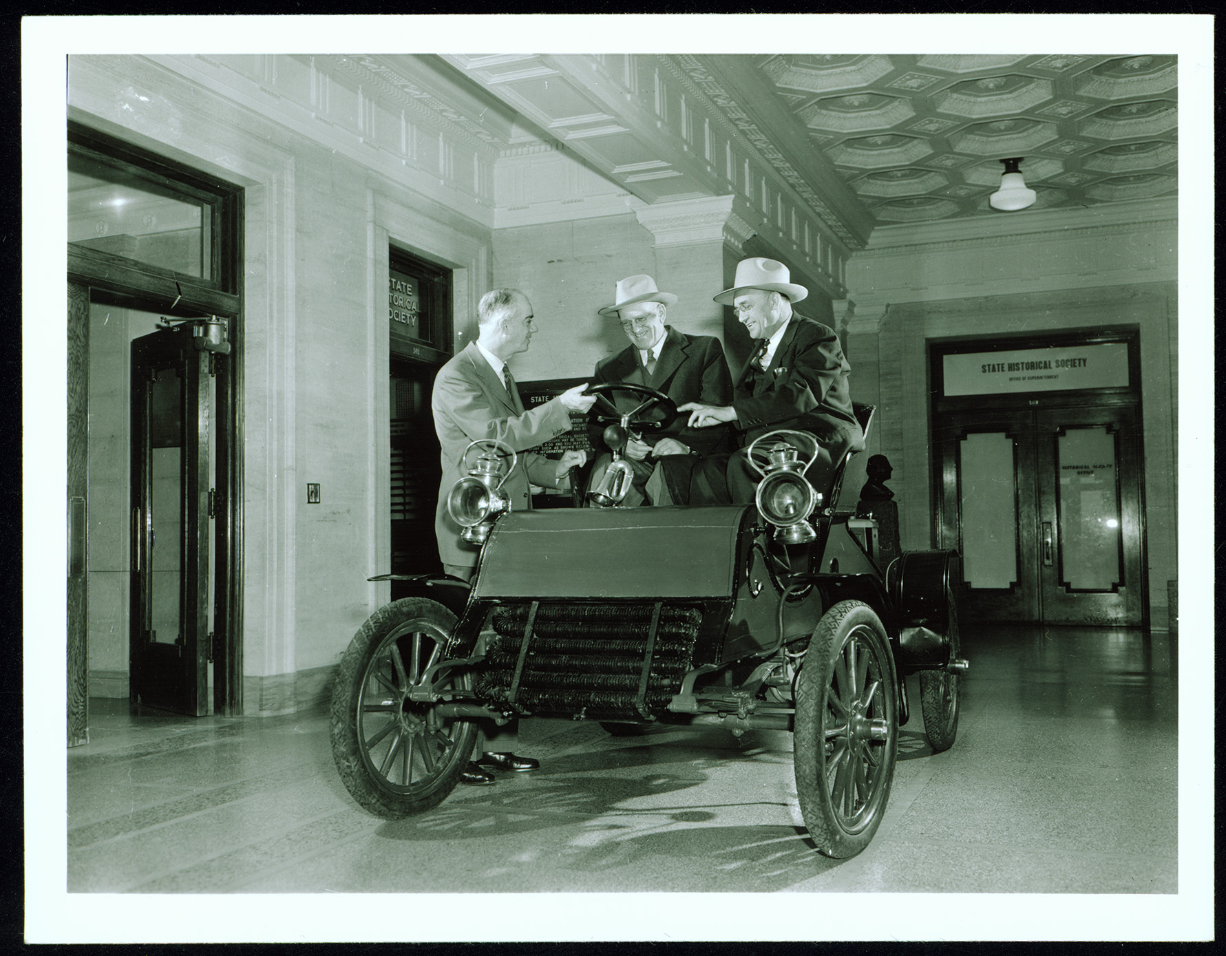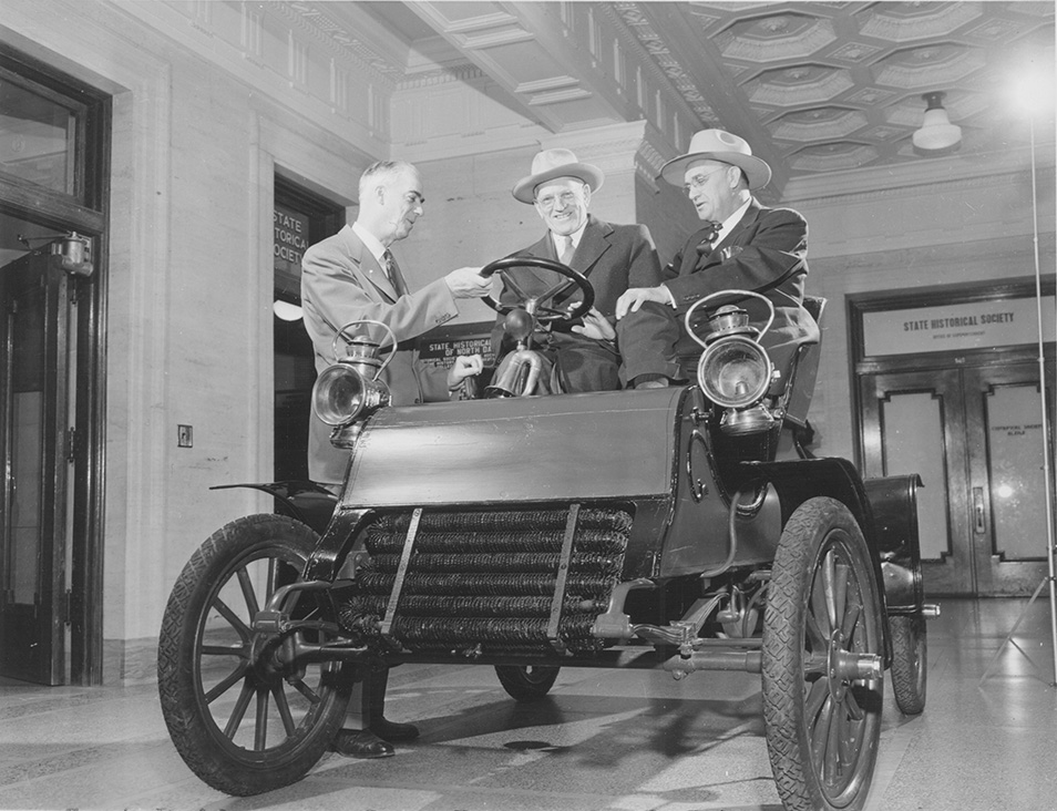 Russell Reid, Governor Norman Brunsdale, and John R. Fleck with a 1904 Cadillac car in the State Historical Society Museum