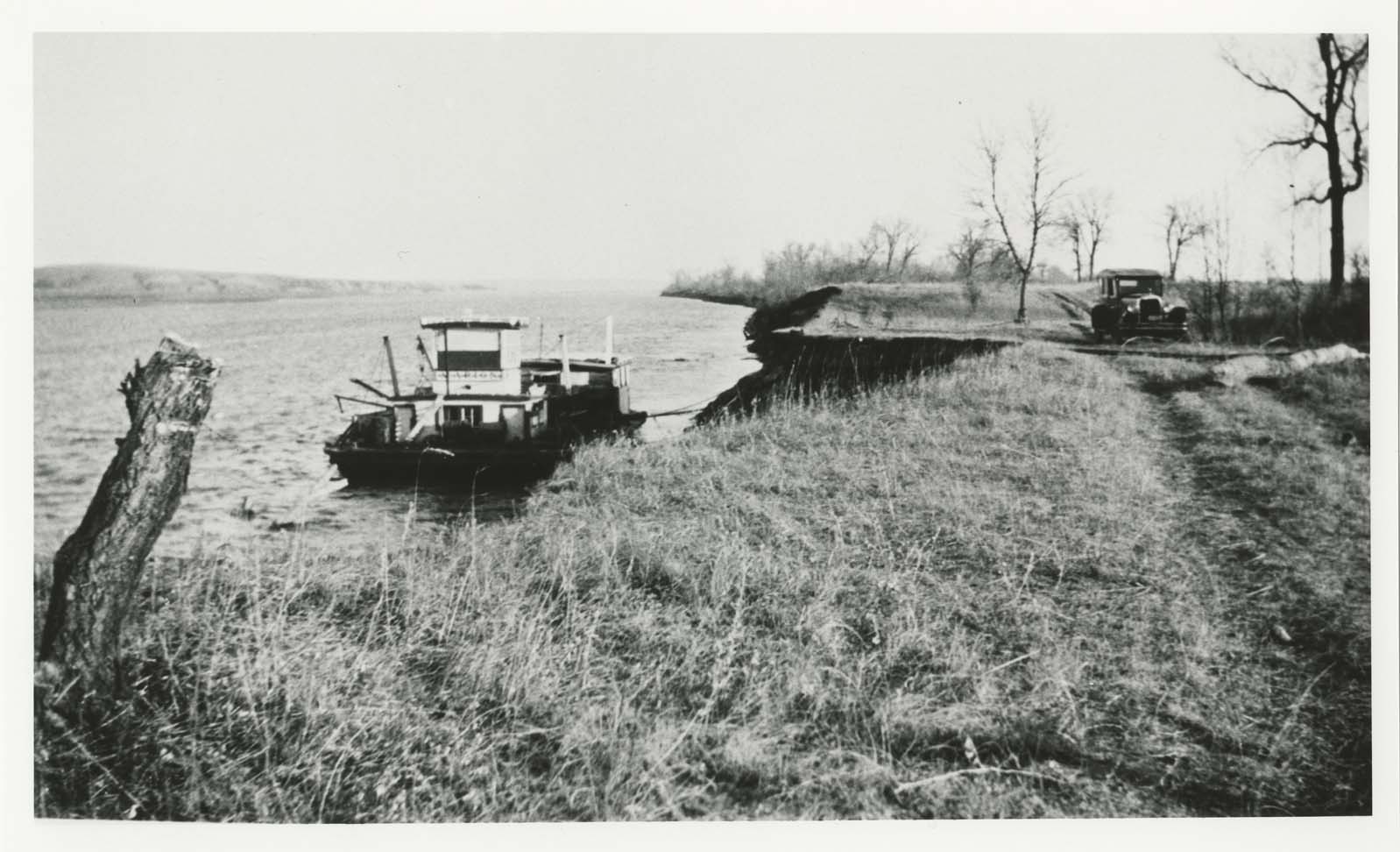 Title: Steamboat "Marion" tied up below road with automobile