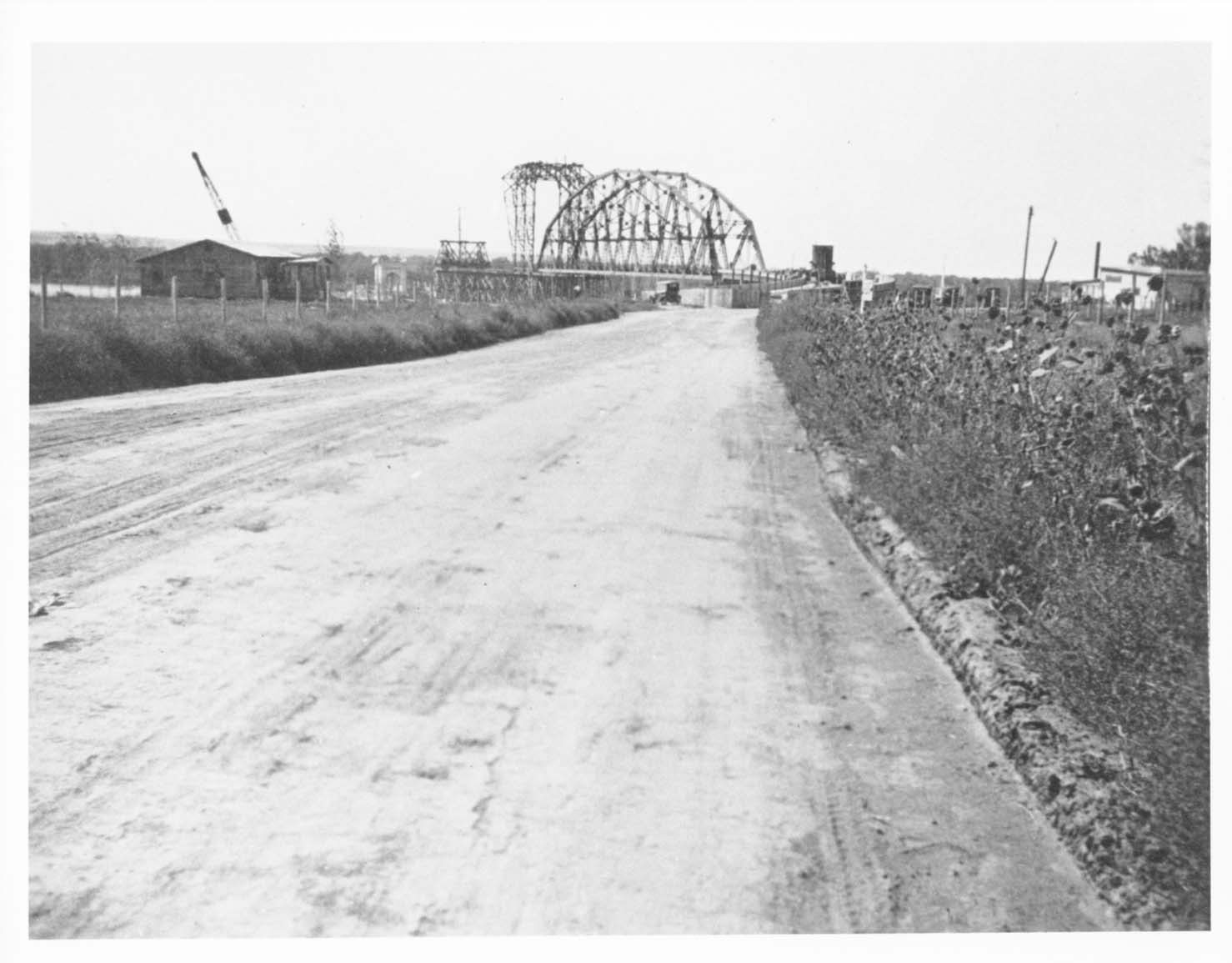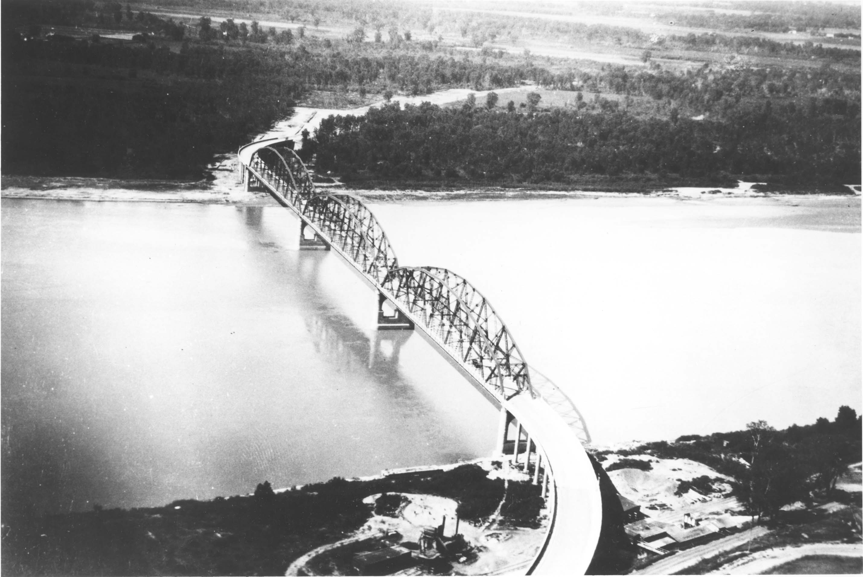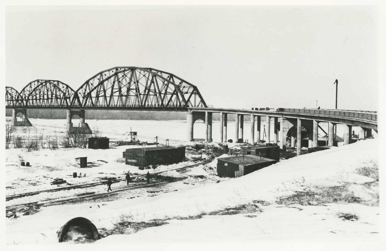 Title: View of the Liberty Memorial Bridge under construction from shore, Bismarck, N.D.