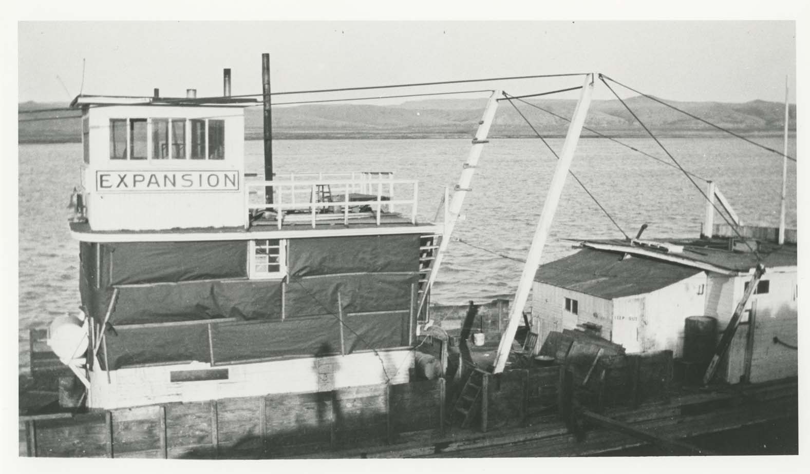 Title: River boat "Expansion" tied up at river's edge