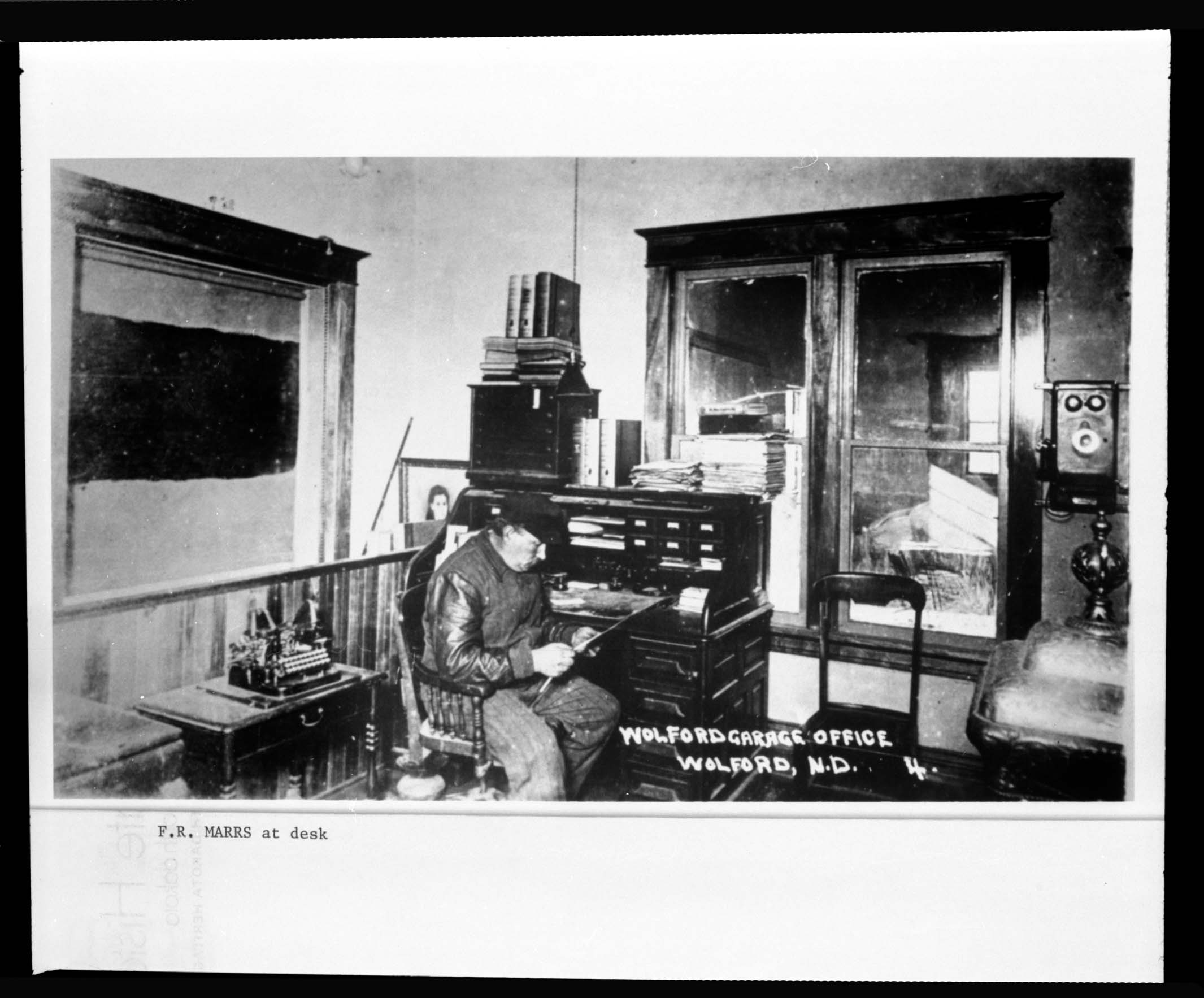 Title: Frank R Marrs at desk in his garage office, Wolford (N.D.)