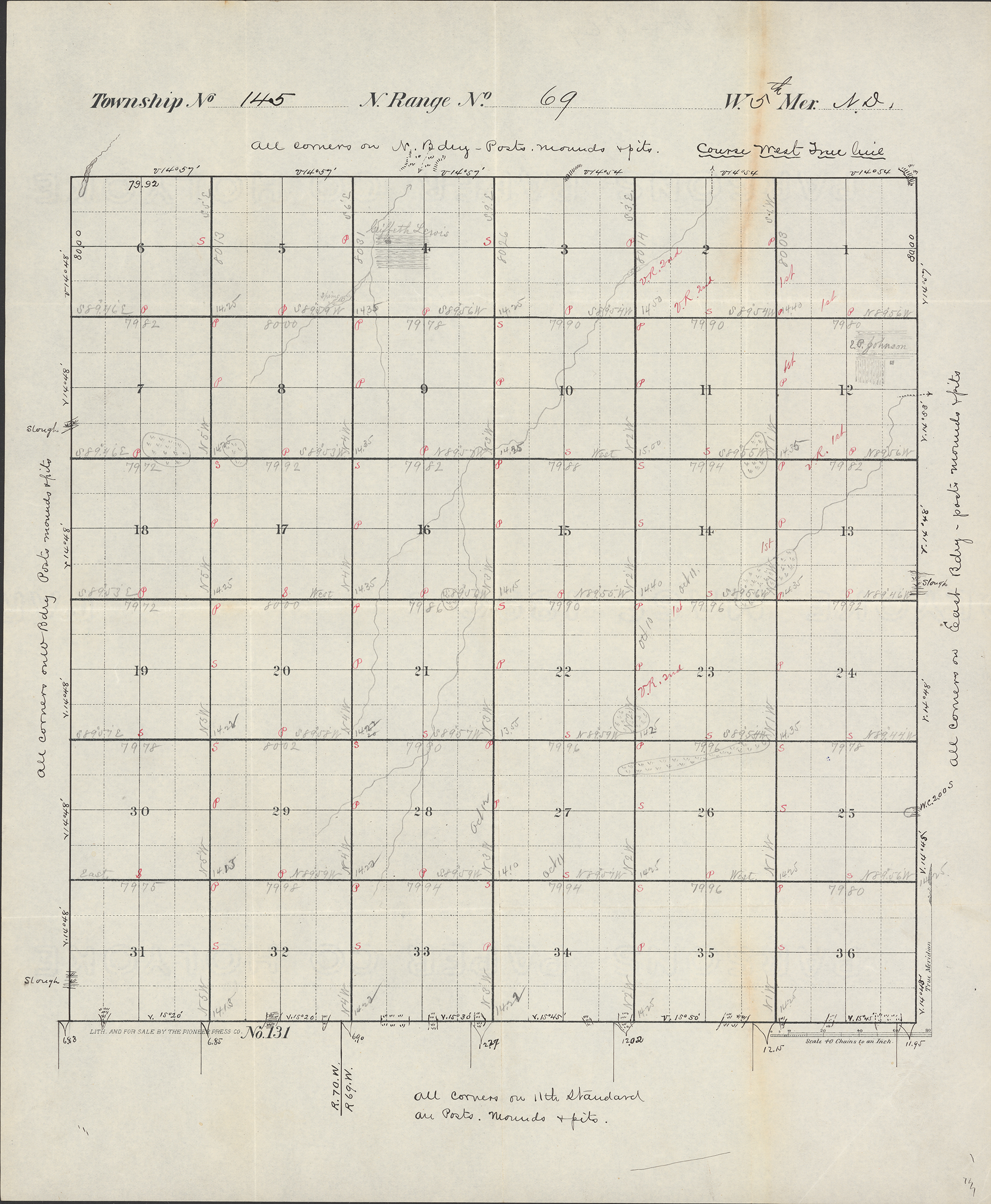 Title: Survey drawing of Township 145 Range 69 W, 5th Meridian N.D.