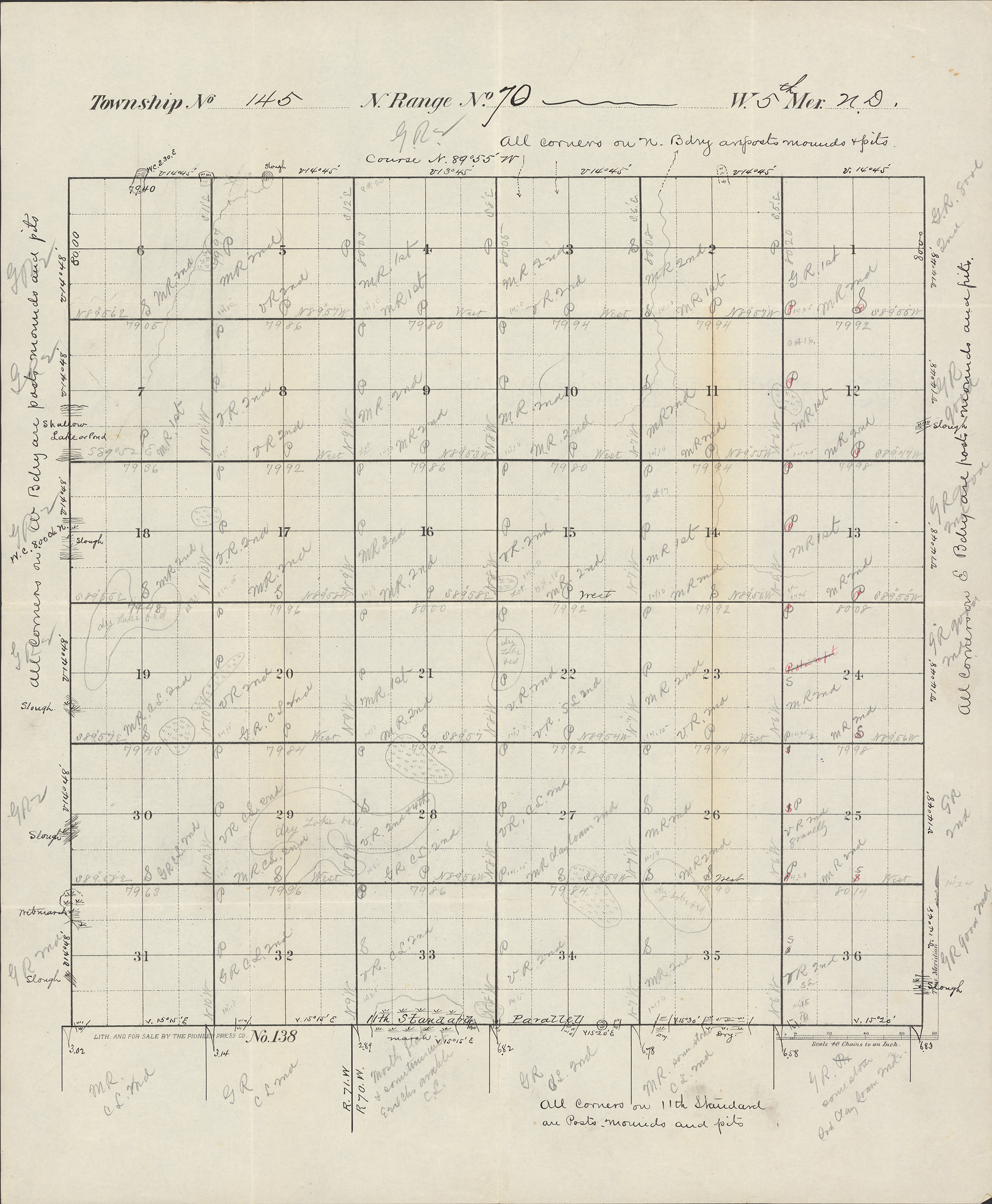 Title: Survey drawing of Township 145 Range 70 W, 5th Meridian N.D.