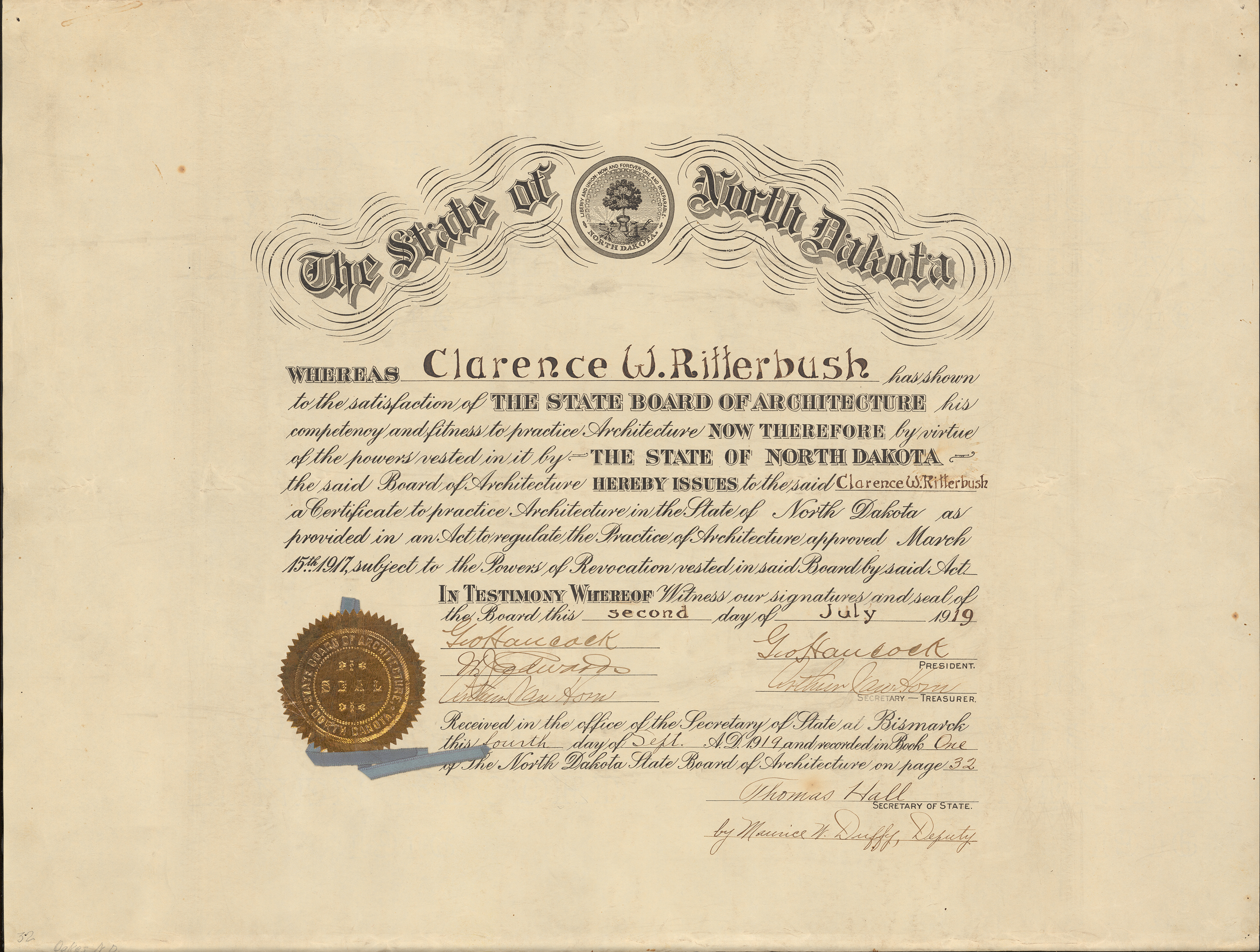 North Dakota State Board of Architecture certificate of Clarence Ritterbush