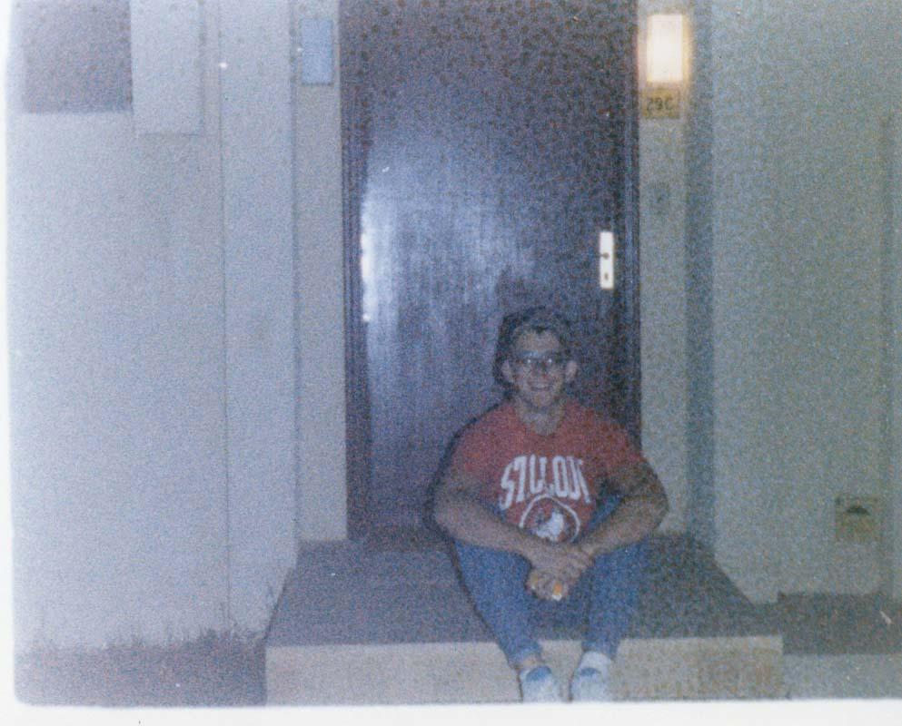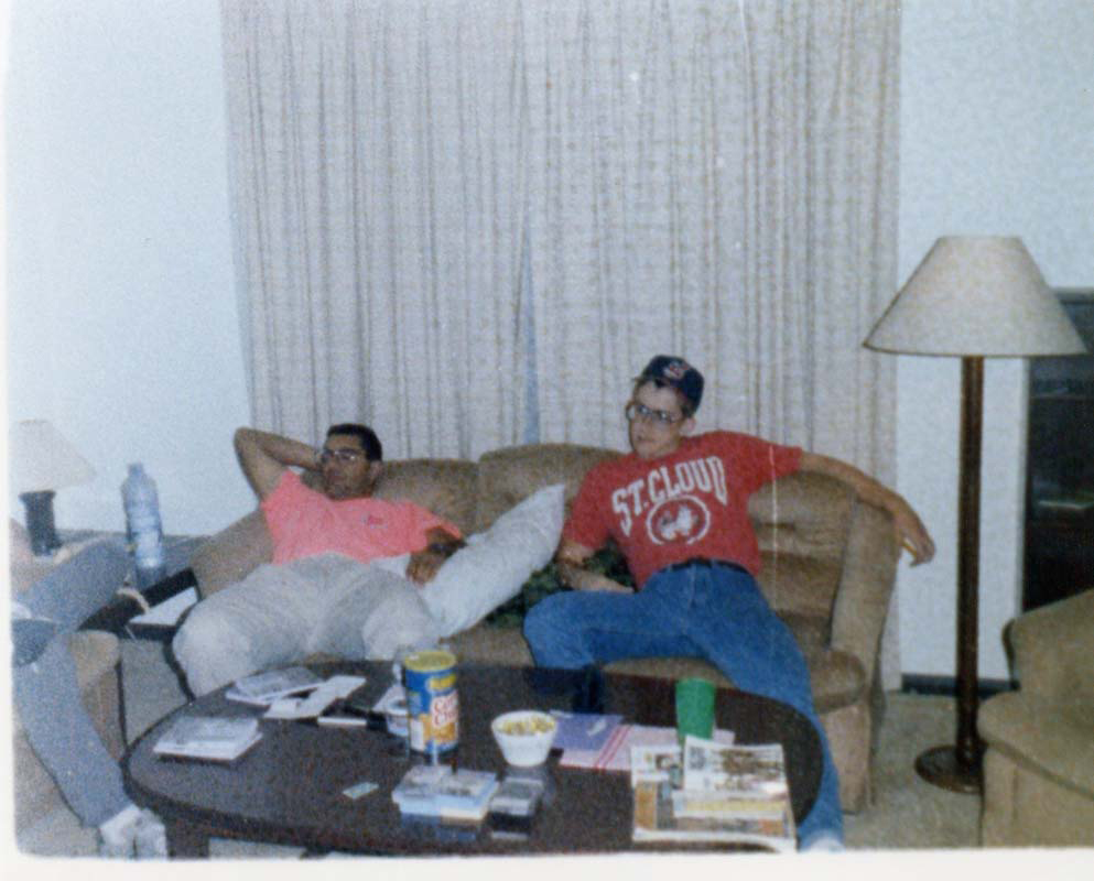 Title: Three photos, one of man with three children, one of people playing volleyball and one of road and mountains.