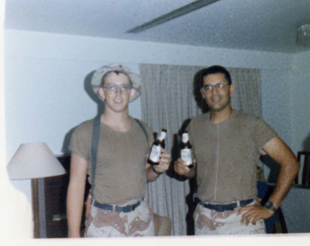 Title: Two photos, one of a man holding a rifle and the other of four servicemen.