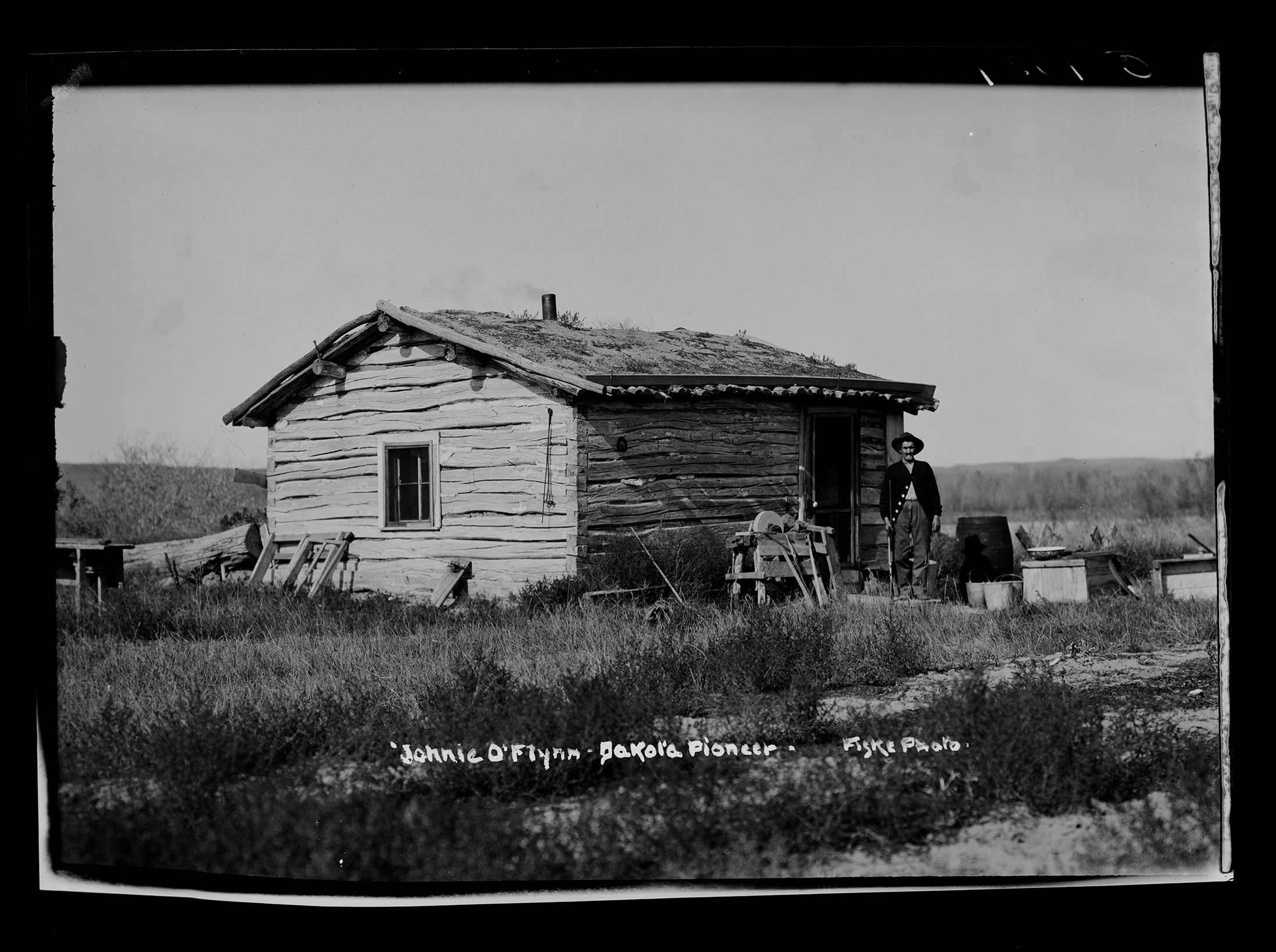 Title: Johnnie O'Flynn, Dakota pioneer, in front of his cabin, Winona (N.D.)