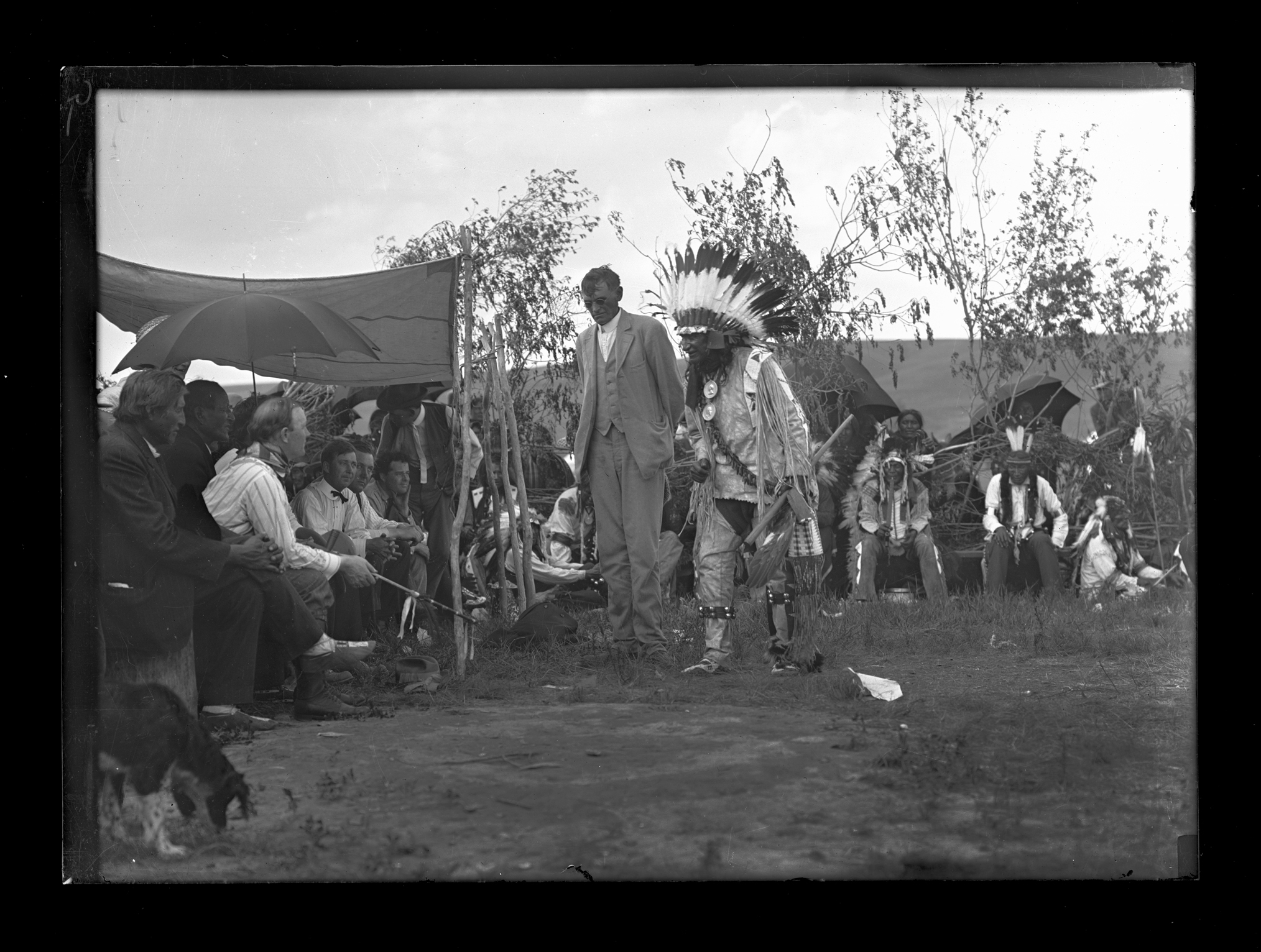 Title: Chief Red Fish [Sitting Bull, Jr.] speaking and John S. Brown interpreting at A. B. Welch's adoption ceremony, Fort Yates (N.D.)