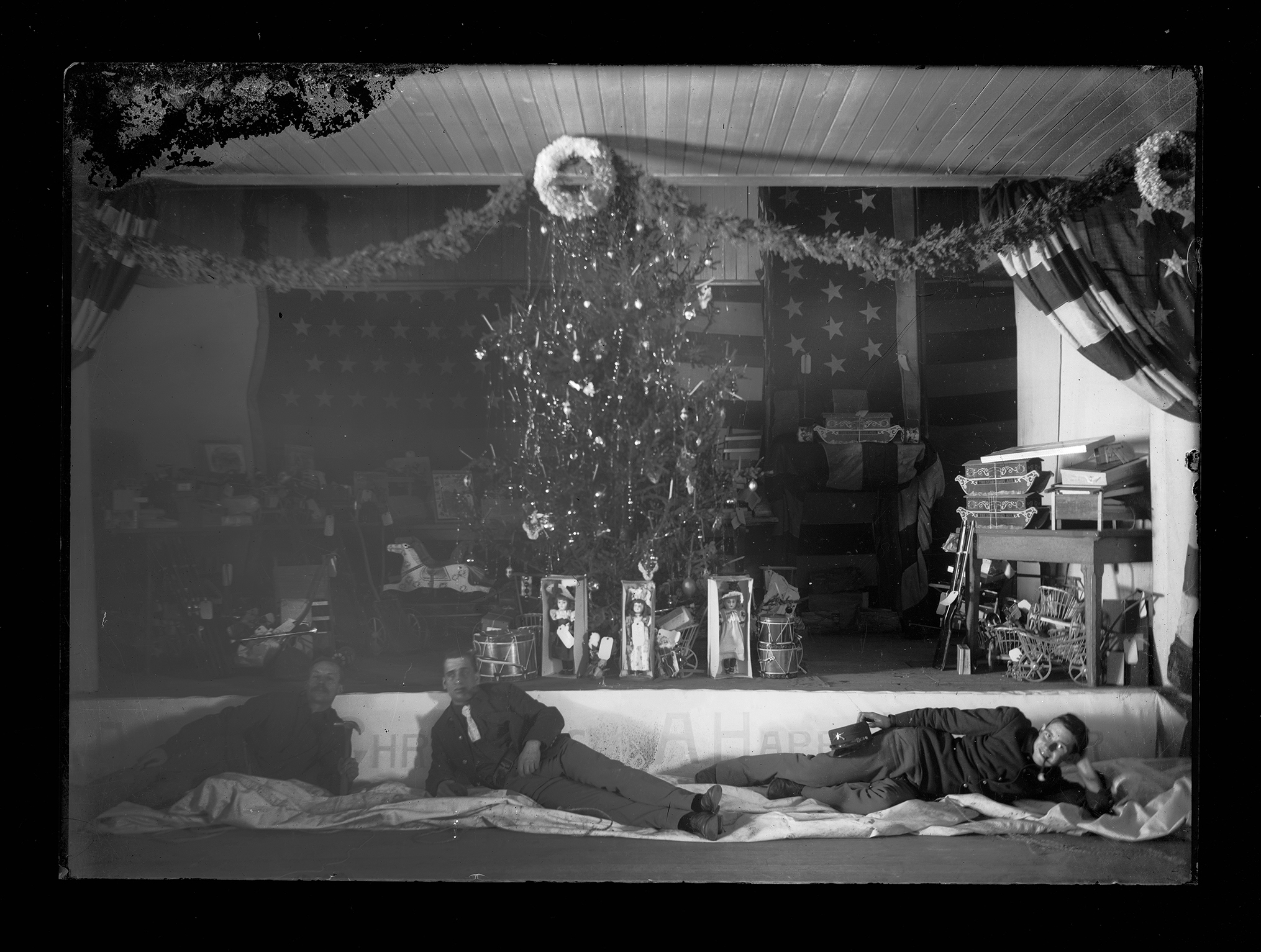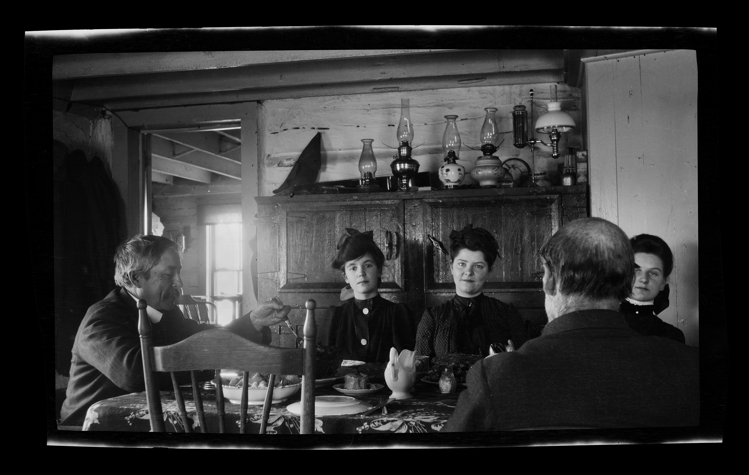Title: Aaron Charles Wells, Evangeline (Eva) Marsh, Louise Clara Wells and others seated at dining table, Cannon Ball (N.D.)