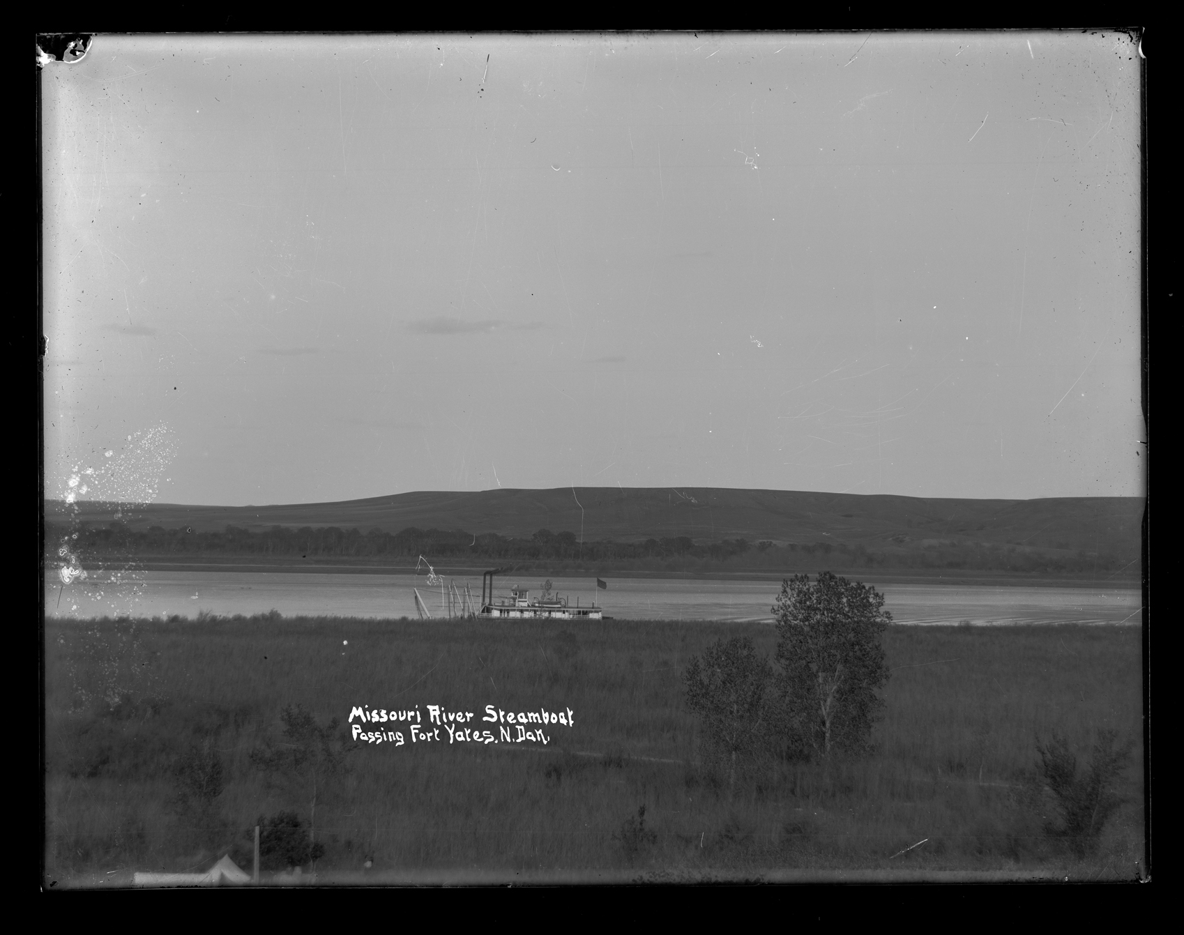 Title: "Missouri River Steamboat passing Fort Yates, N.Dak."