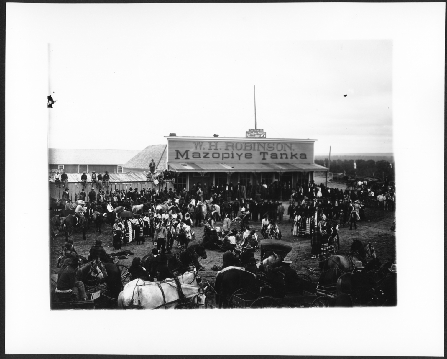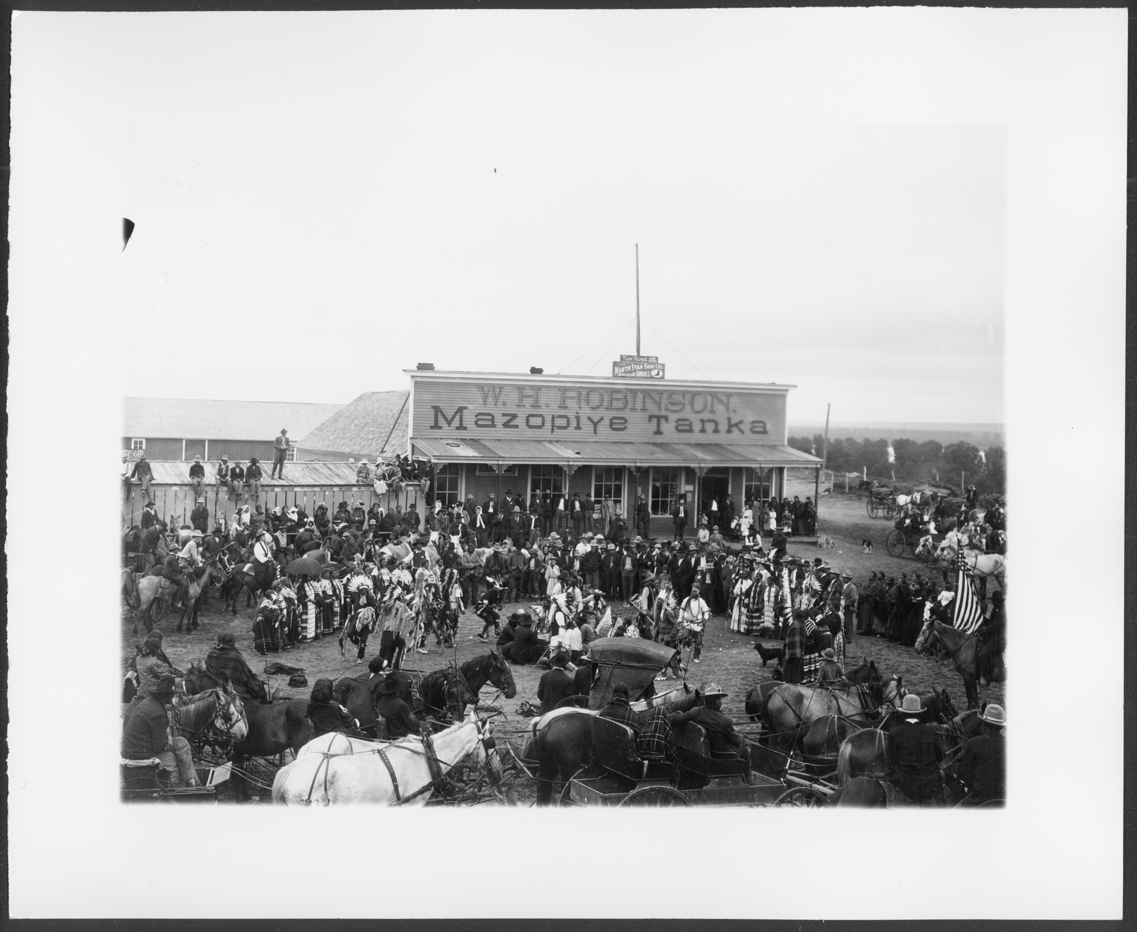 Title: Indian dance in front of the W. H. Robinson (Mazopiye Tanka) "Big Store," Fort Yates (N.D.)