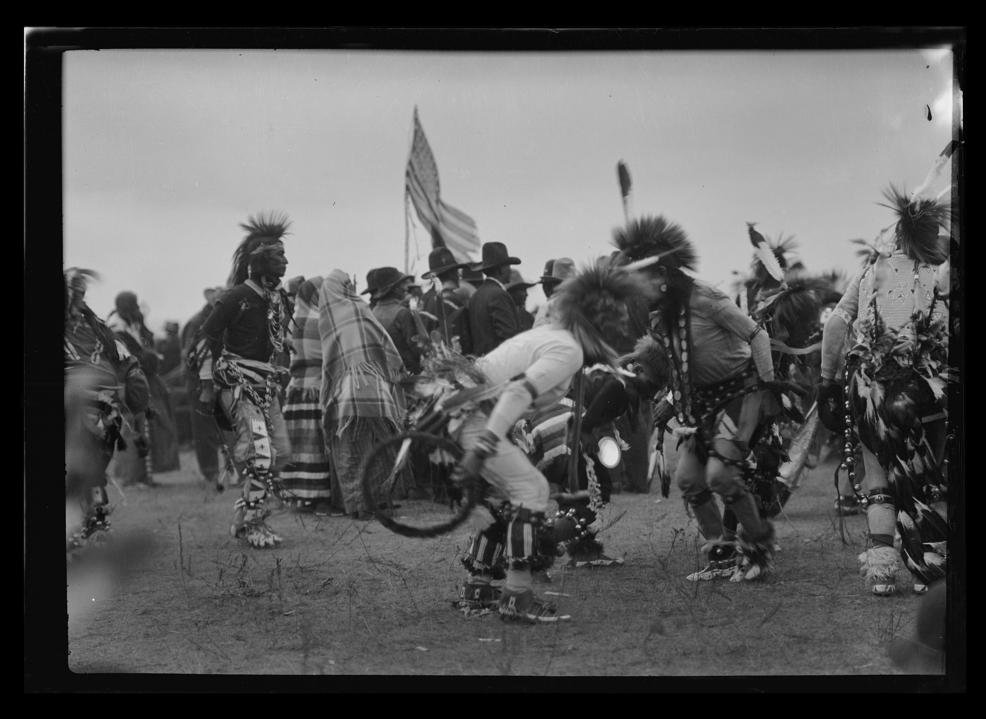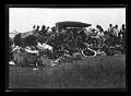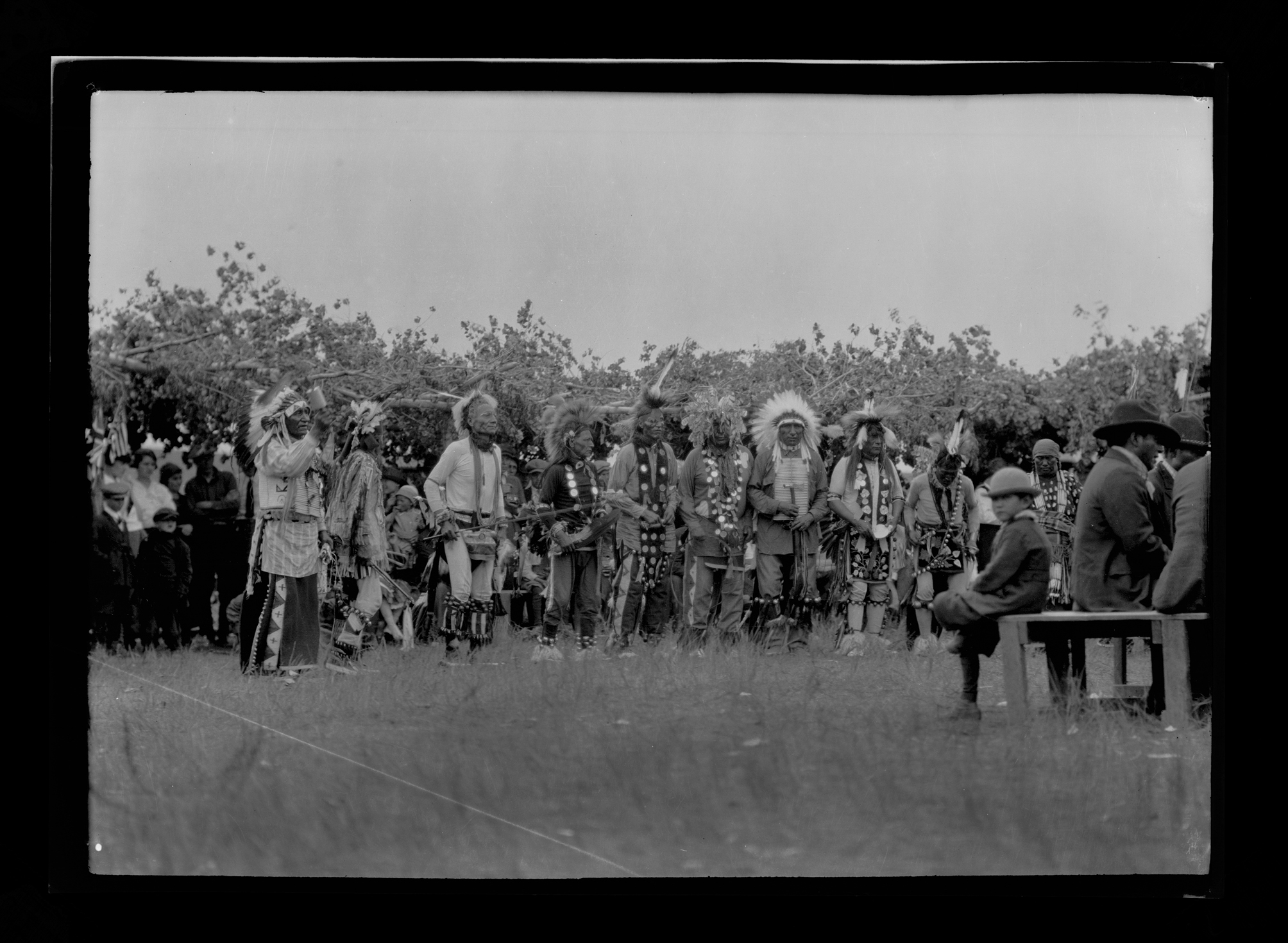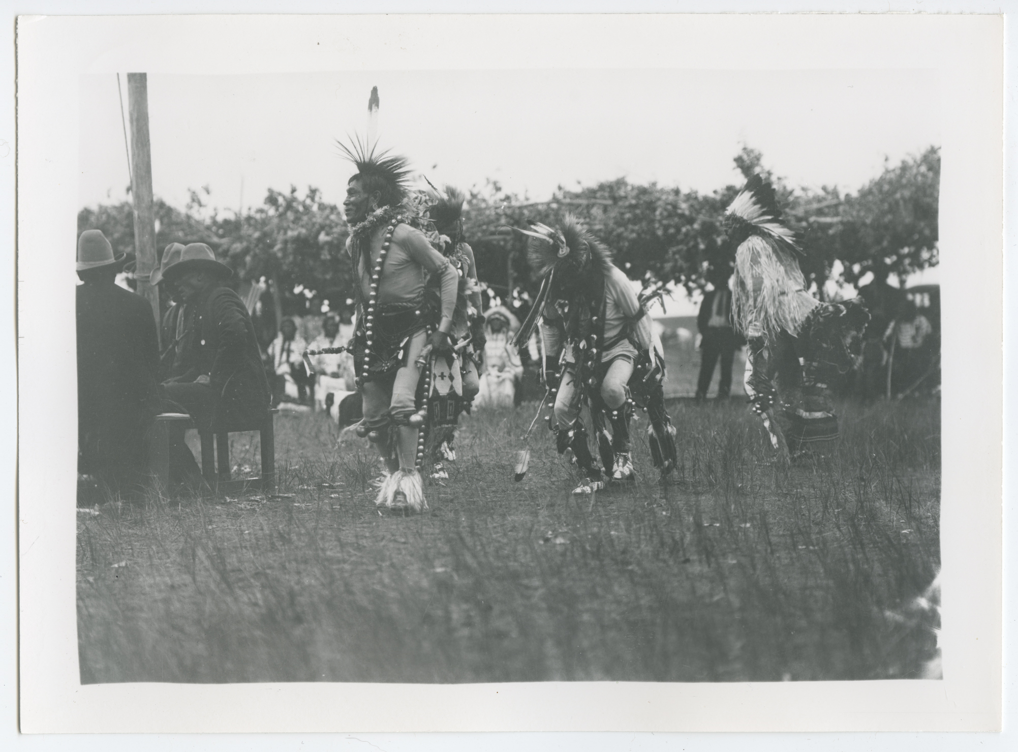Title: Indians in dancing regalia seated on edge of dance grounds automobiles in background