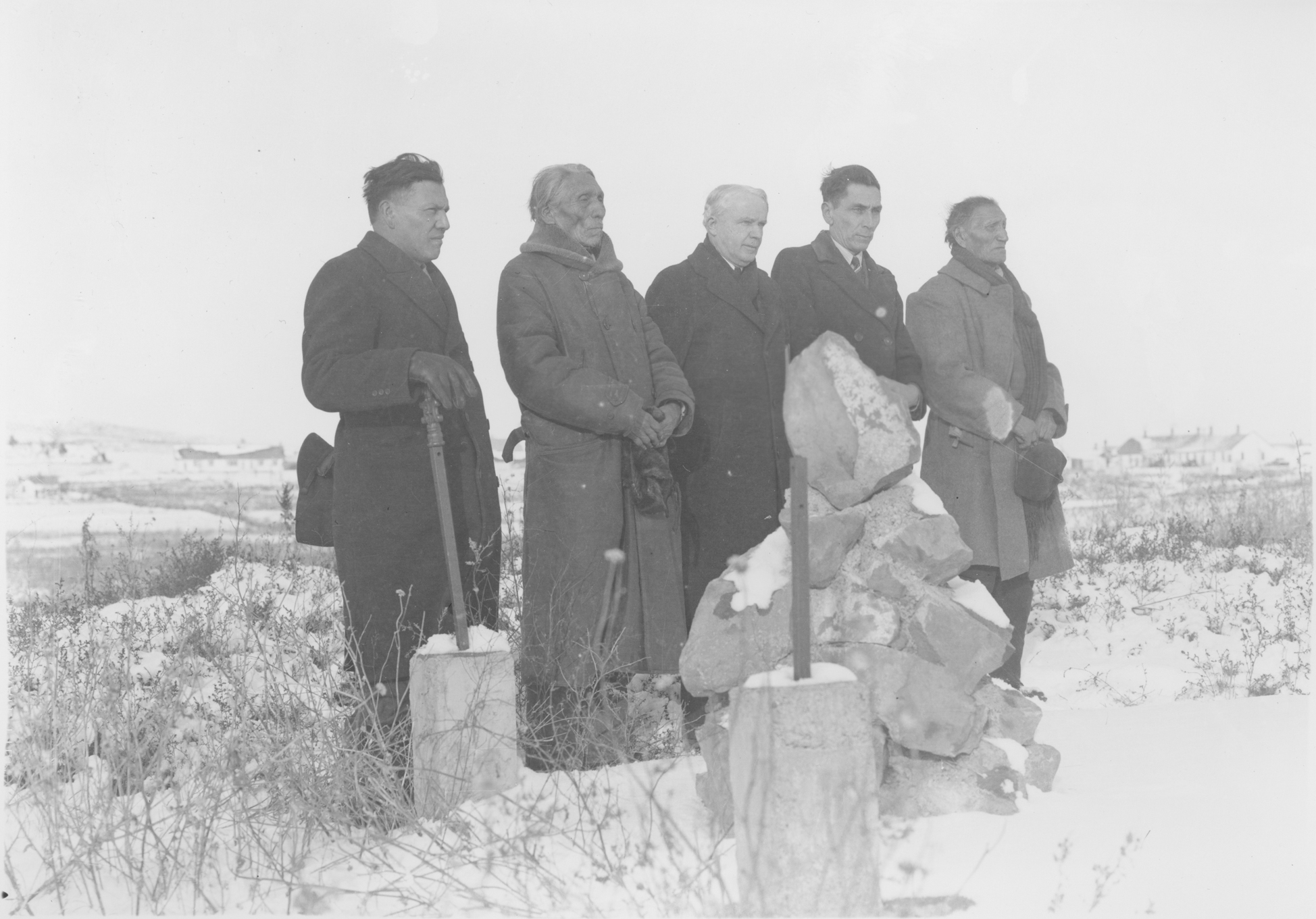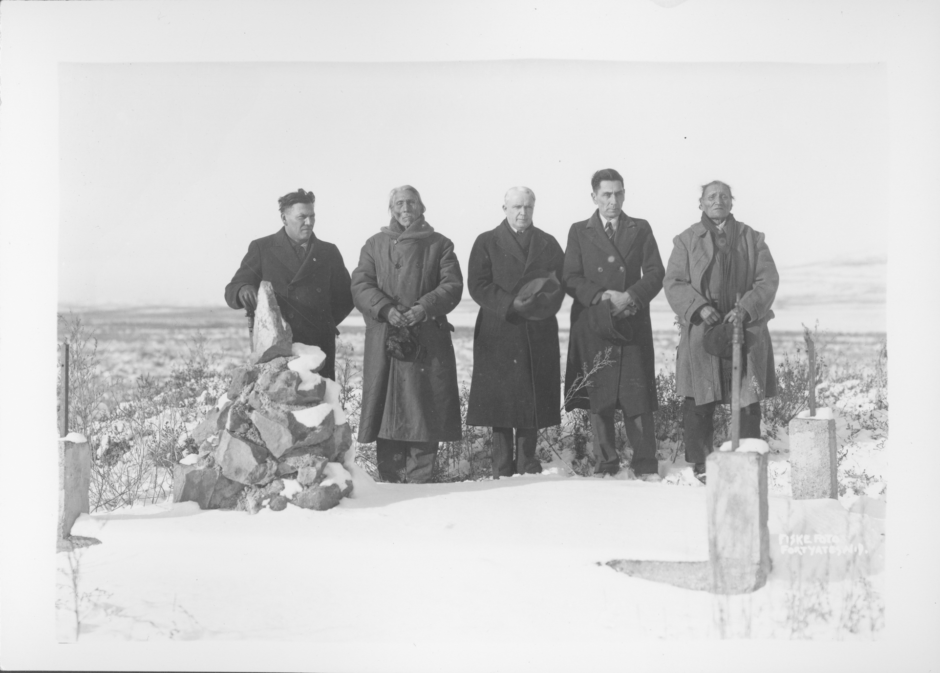 Title: John Gates, Little Soldier, C. E. Faris, Frank B. Zahn and Swift Hawk standing behind Sitting Bull's grave, Fort Yates (N.D.)