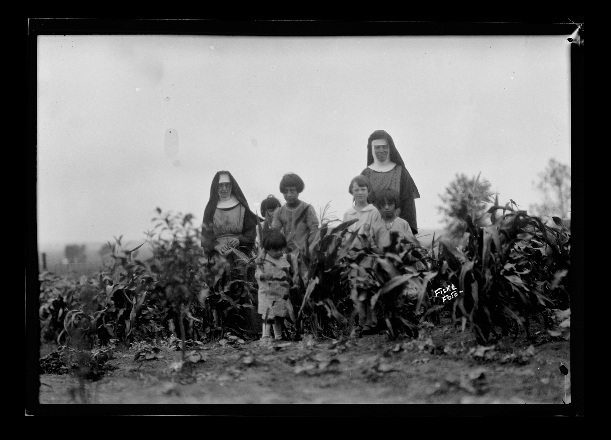 Title: Sister Cherubin and another Catholic sister in garden with children, Fort Yates (N.D.)