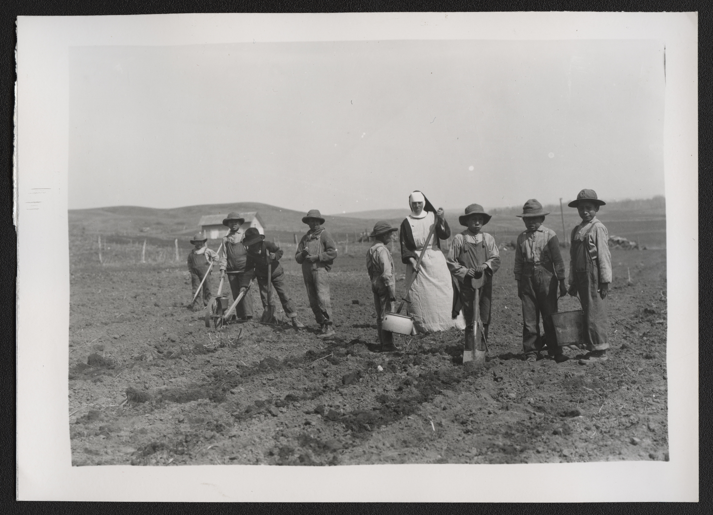 Title: Catholic sister and boys tilling garden, Fort Yates (N.D.)