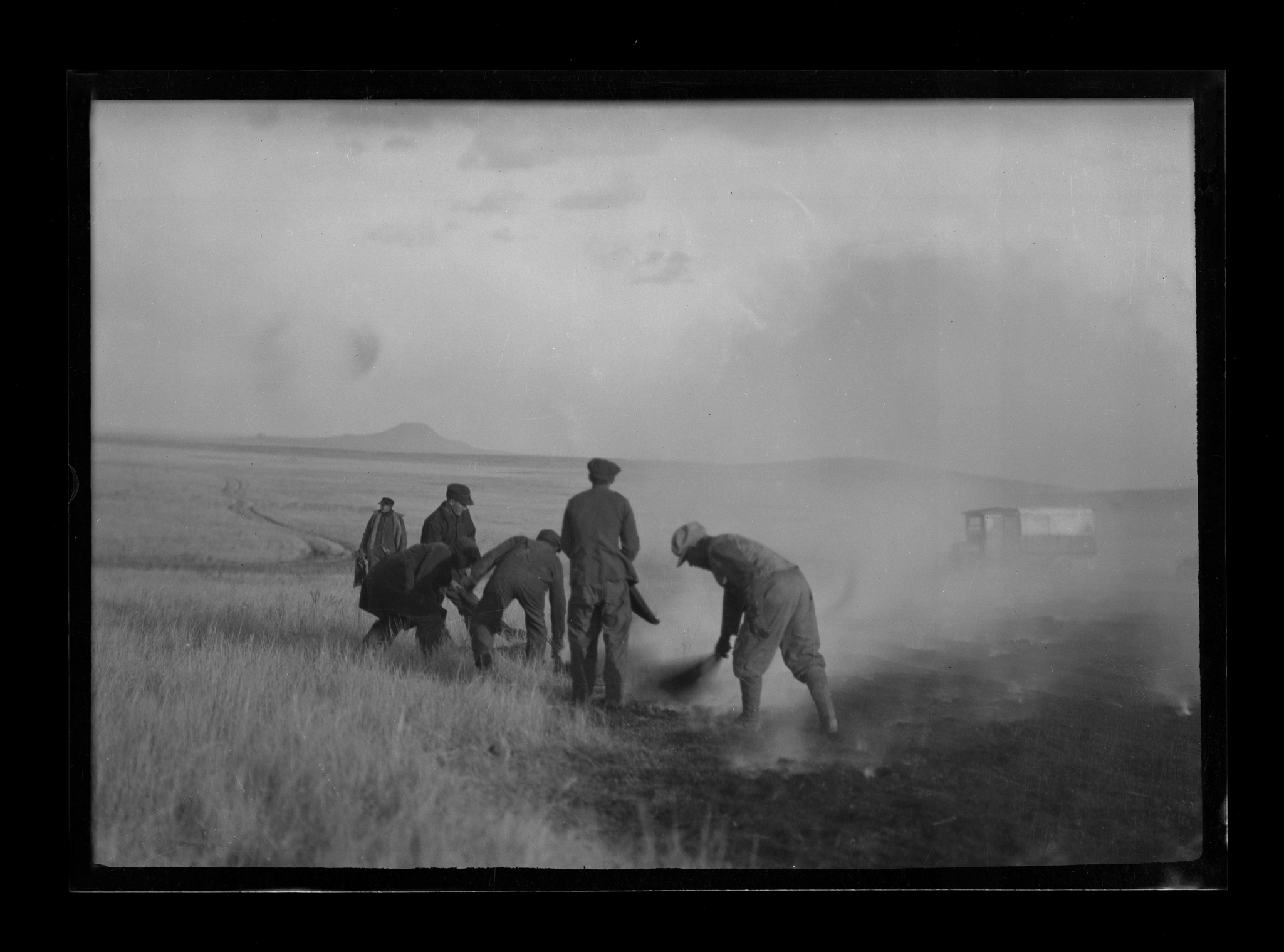 Title: Men fighting prairie fire, Kenel (S.D.)