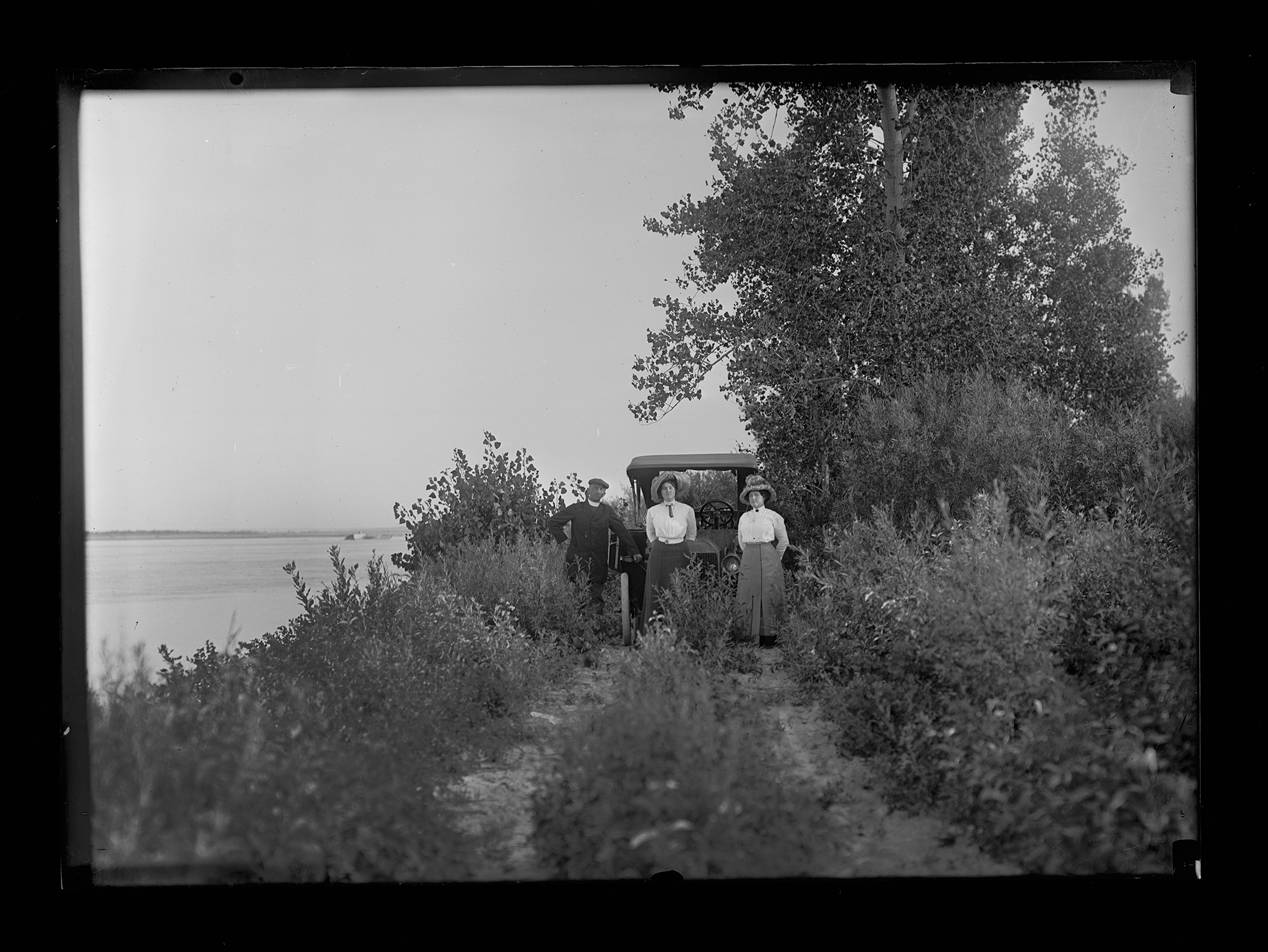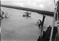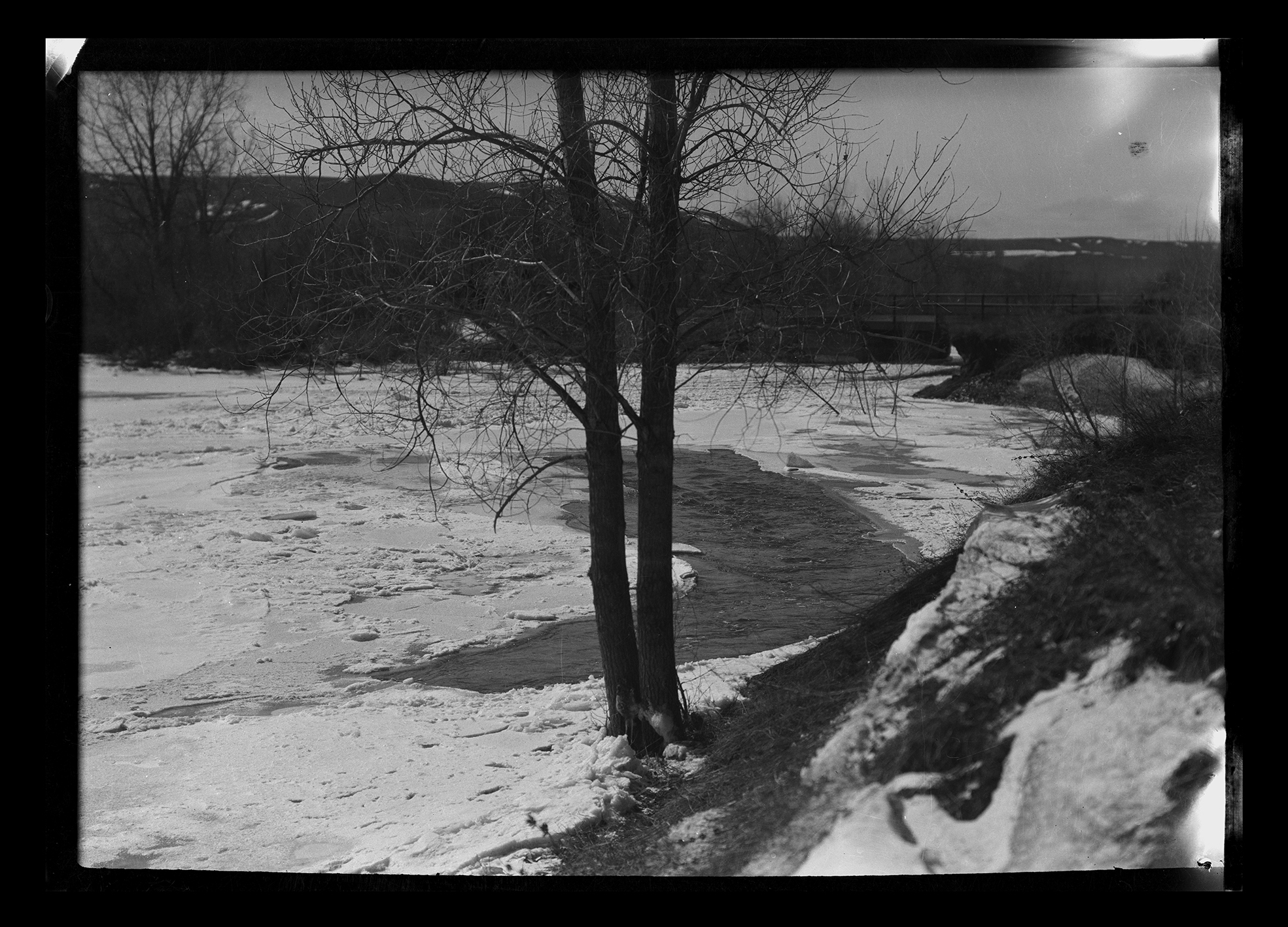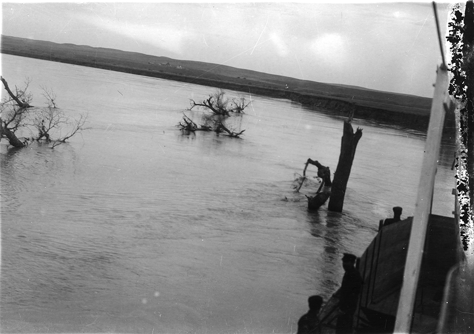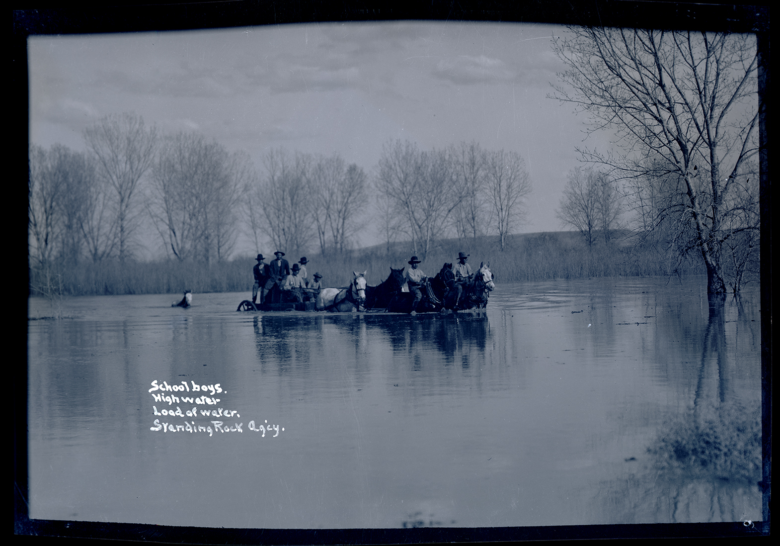 Title: School boys and horse drawn wagons fording Missouri River in deep water