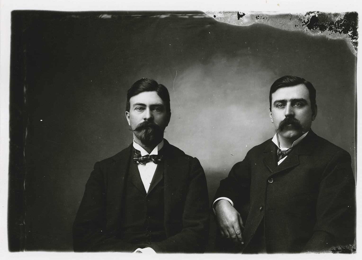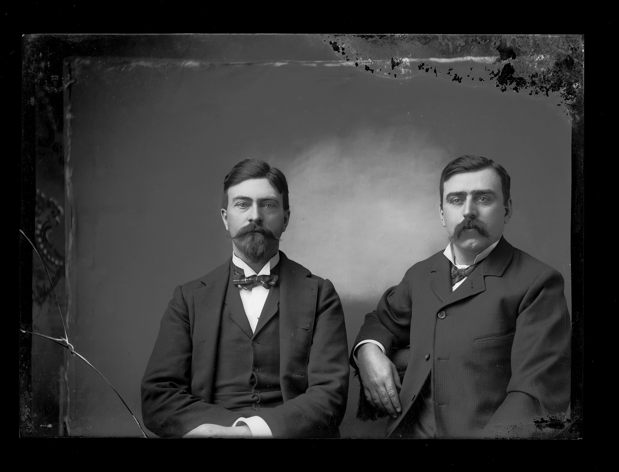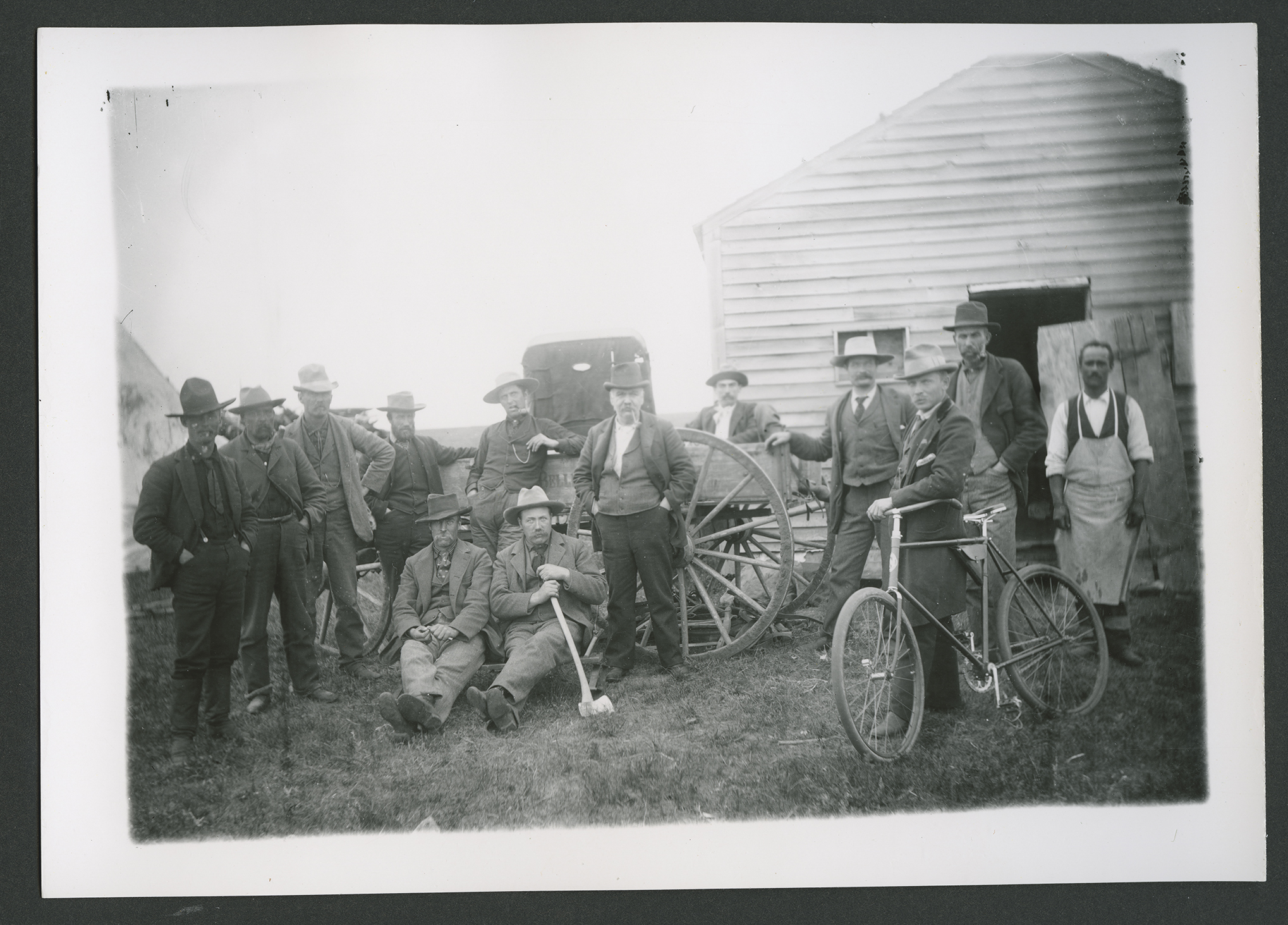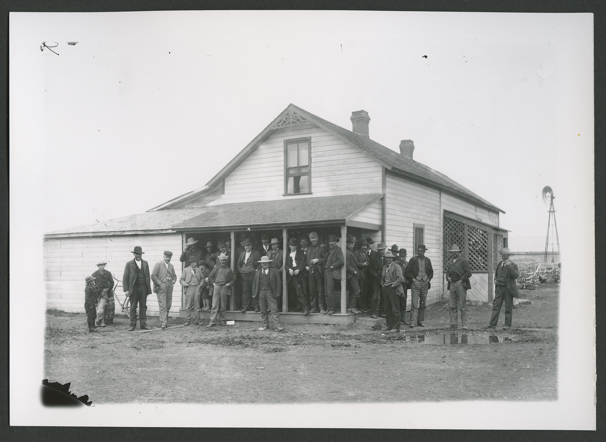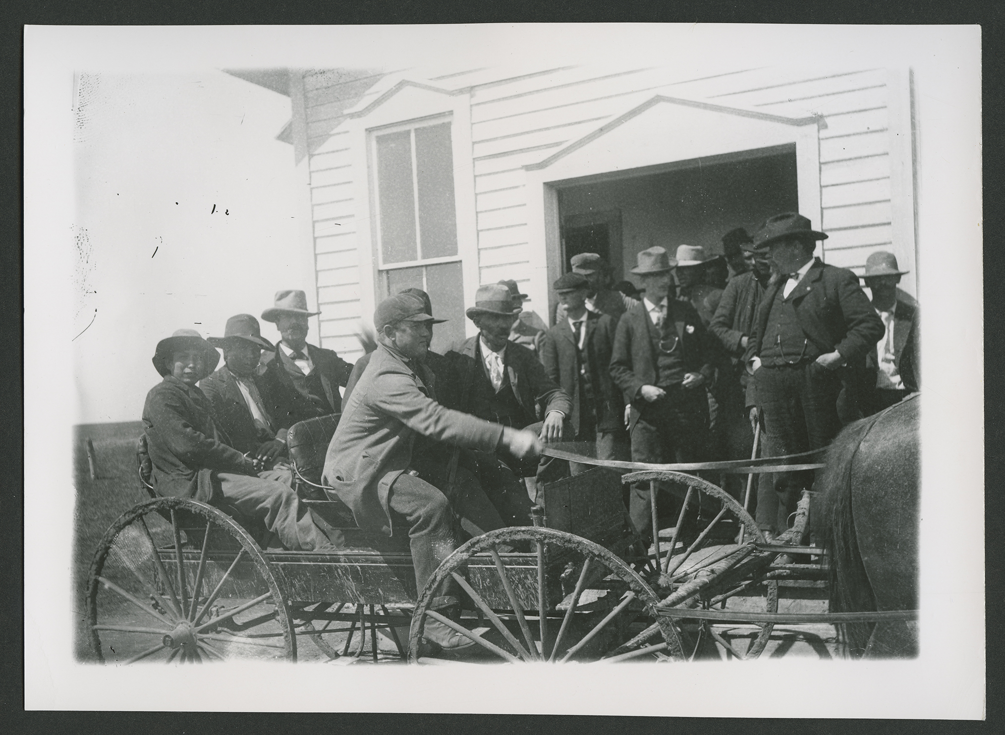 Title: Men and group in a wagon outside the Emmons County Courthouse, Williamsport (N.D.)