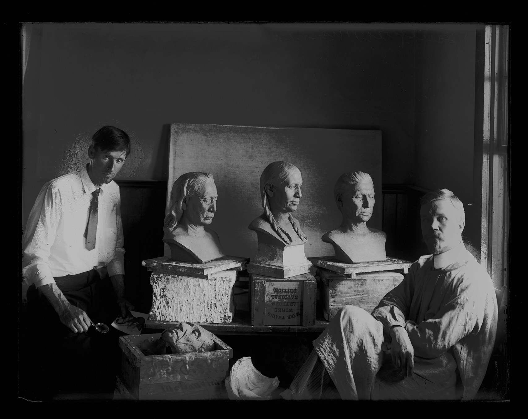 Title: Frank Fiske and sculptor Michka with bust of Mrs. Marpiya Waste Good Cloud