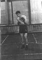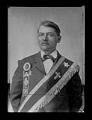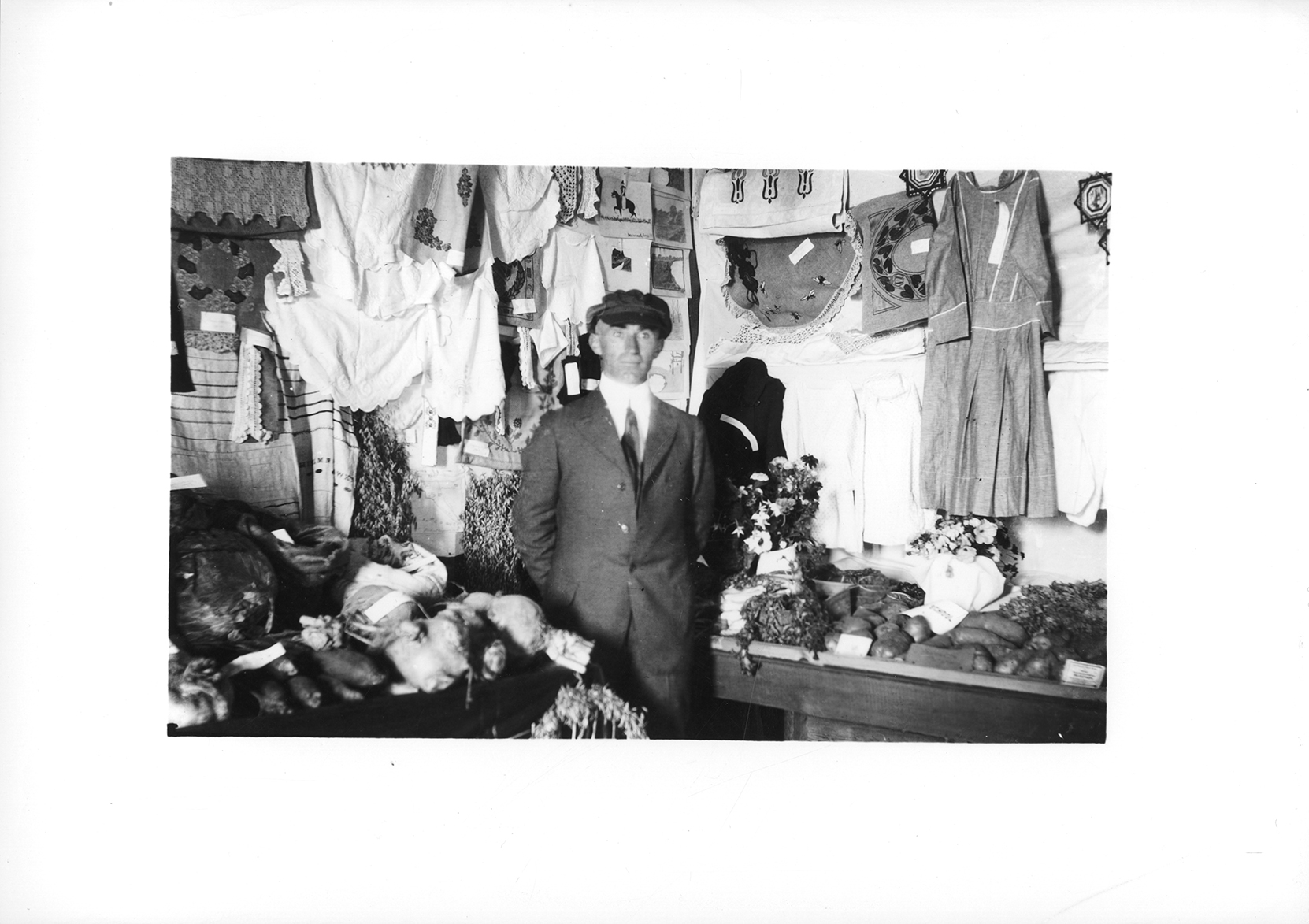Title: Man standing among garden produce and sewing exhibits at one of the agency's fairs
