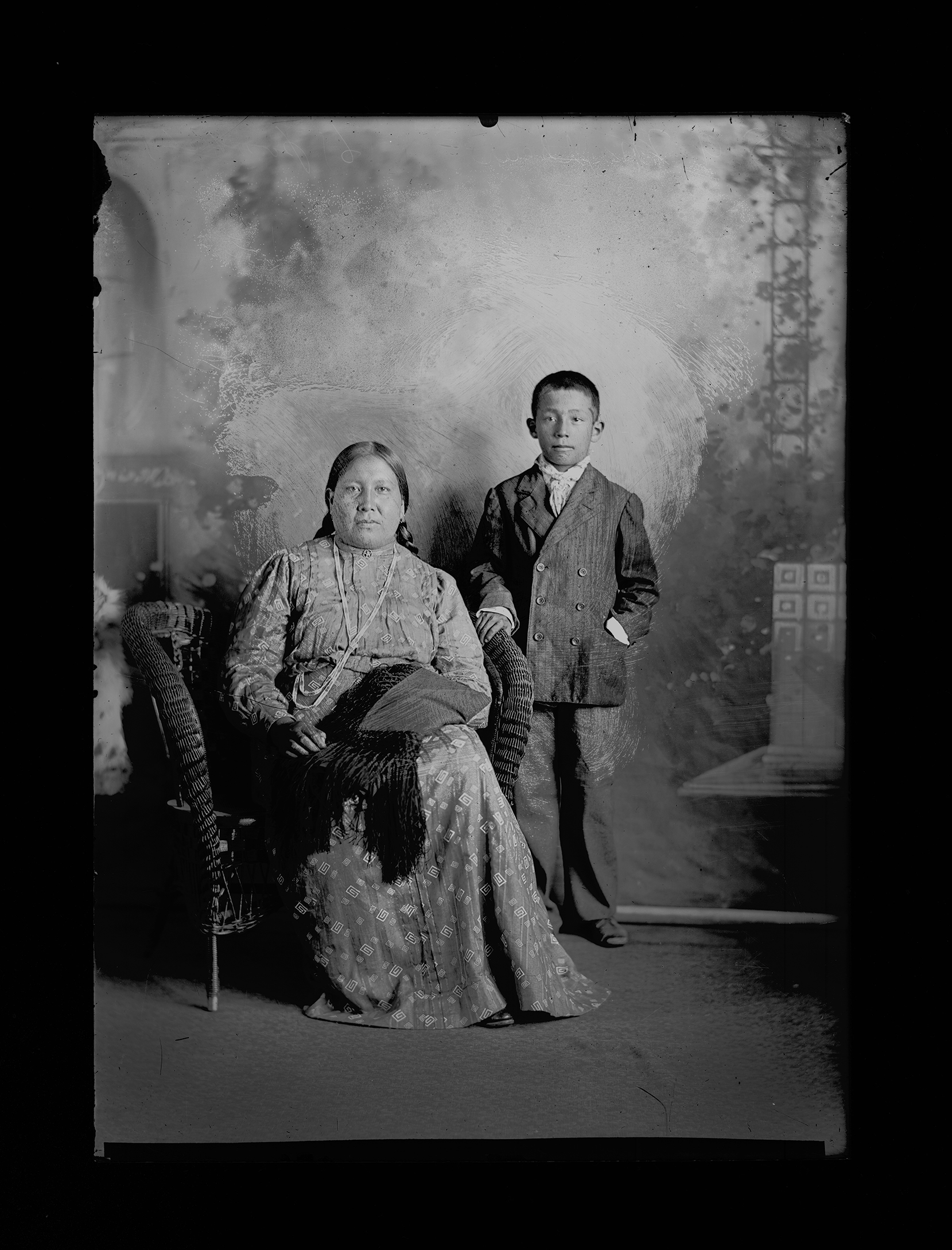 Title: Mrs. Aloysius Scholastica Mad Bear and boy, full length studio portrait