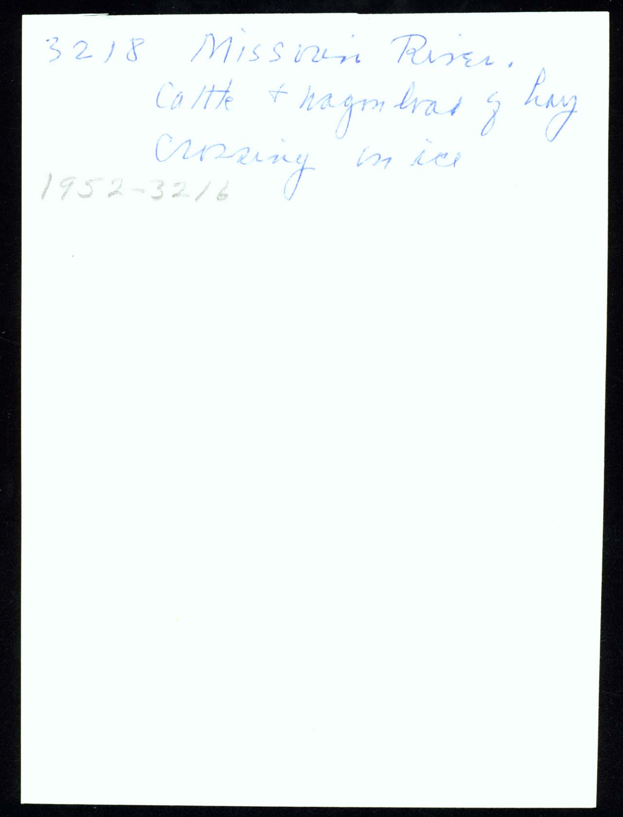 Title: Cattle and wagonload of hay crossing ice on Missouri River