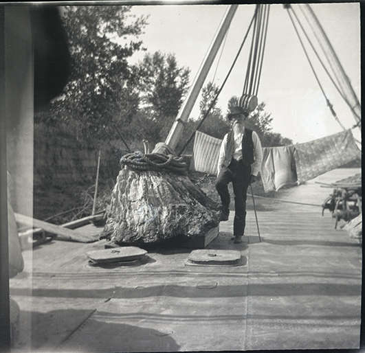Title: Captain Belk with petrified tree trunk aboard snag boat Mandan