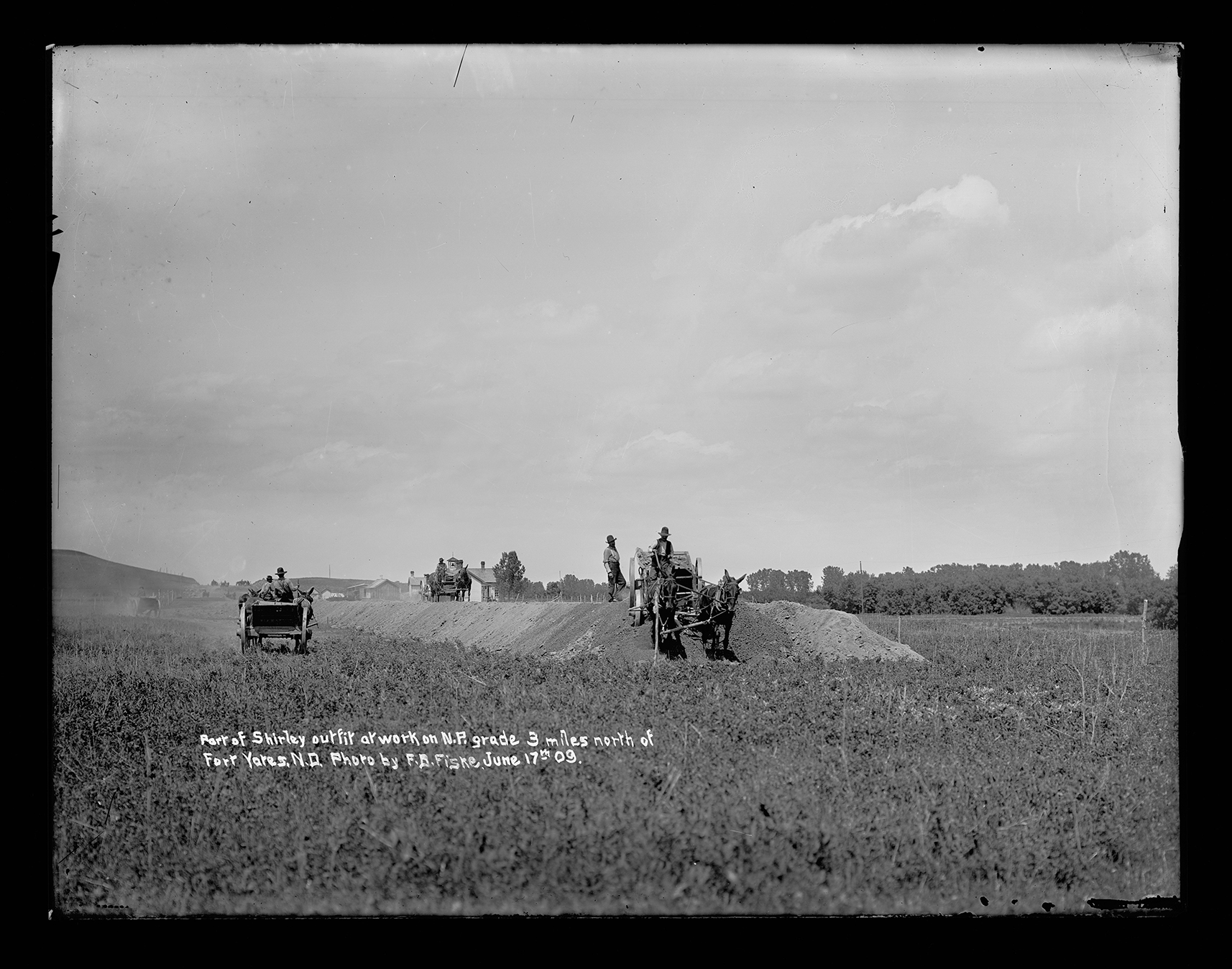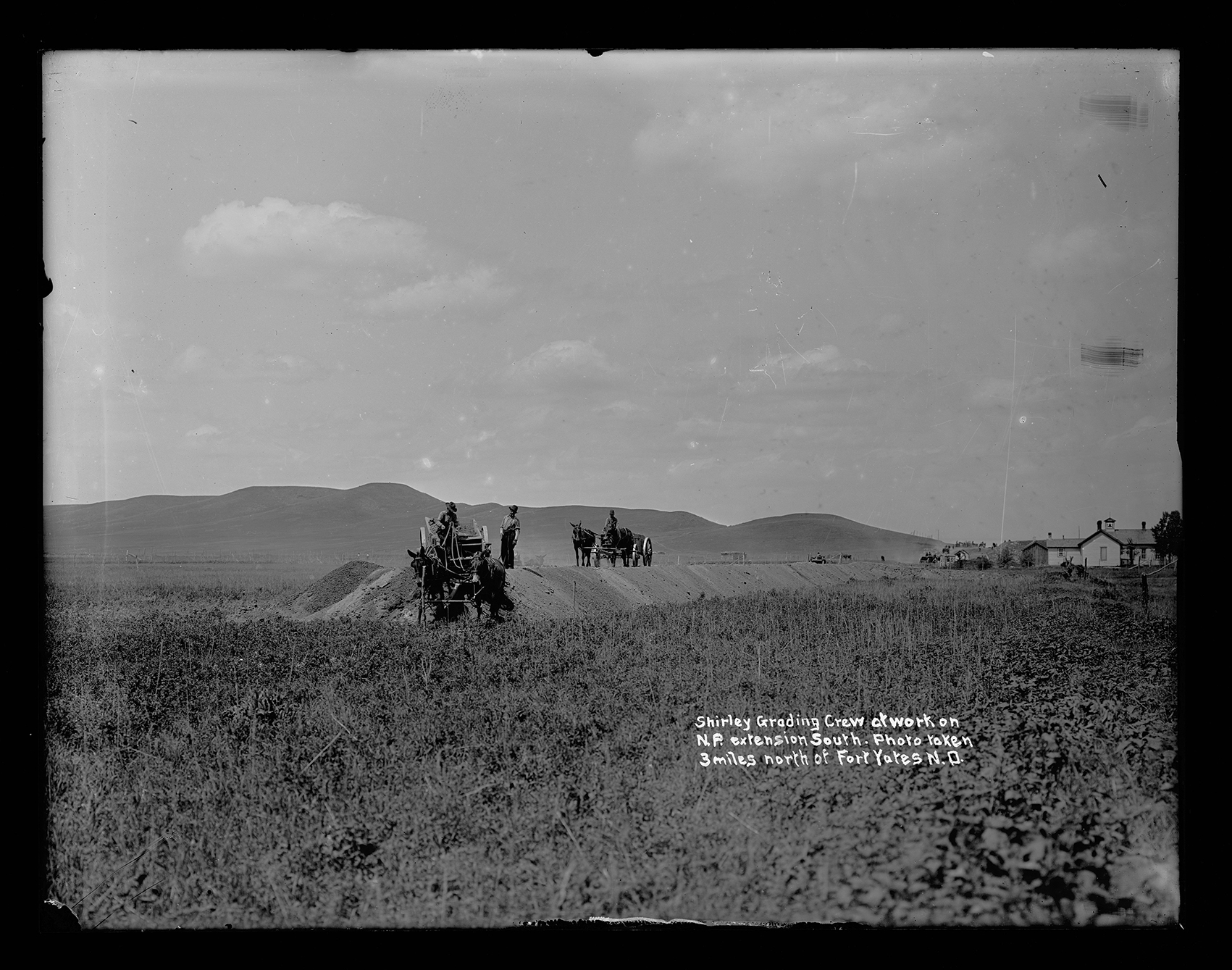 Title: Shirley Grading Crew at work: Horse drawn graders leveling grade for Northern Pacific Railroad three miles north of Fort Yates (N.D.)