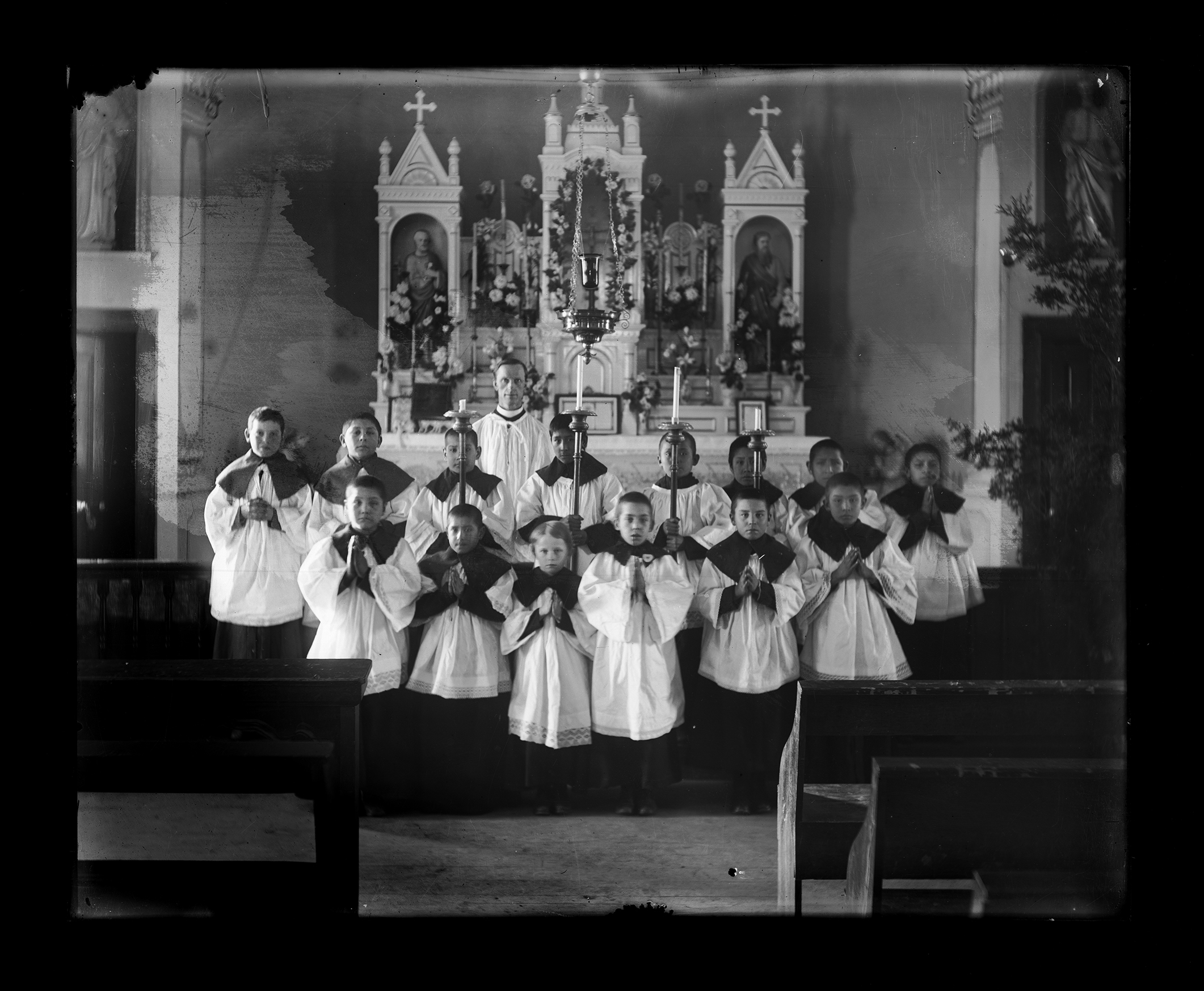 Title: Father Bernard Strassmaier and altar boys at St. Bernard Catholic Church, Fort Yates (N.D.)