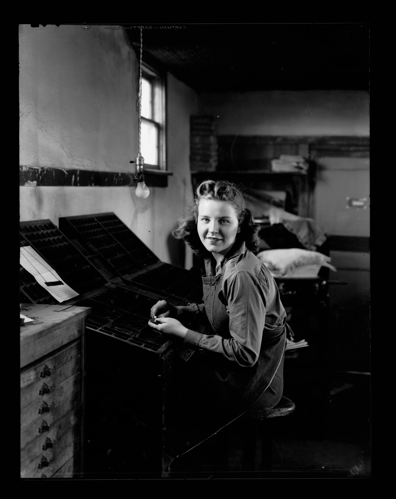 Title: Francine Fiske setting type for the Sioux County Pioneer Arrow