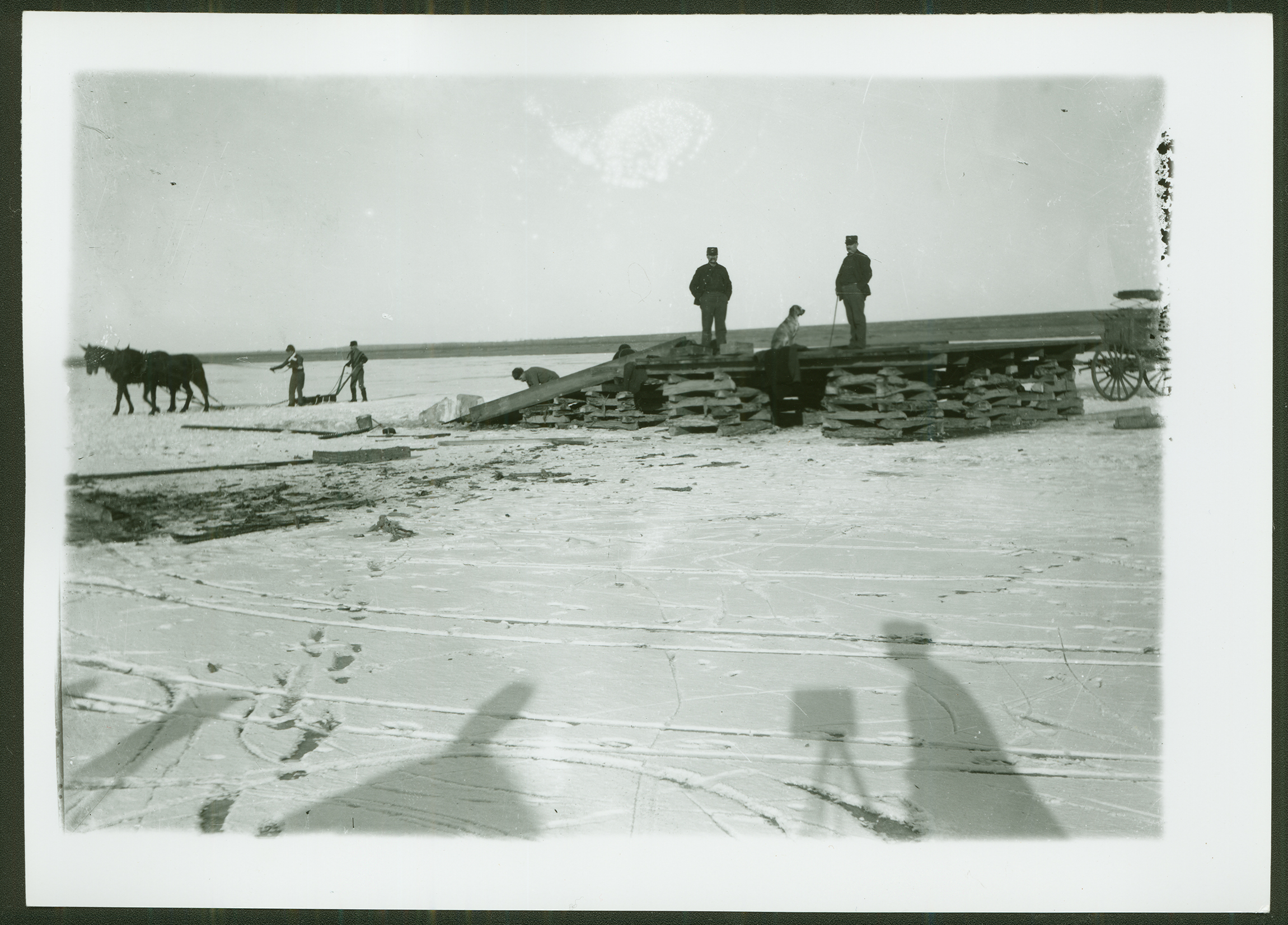 Title: Soldiers cutting ice on the Missouri River at Fort Yates (N.D.)